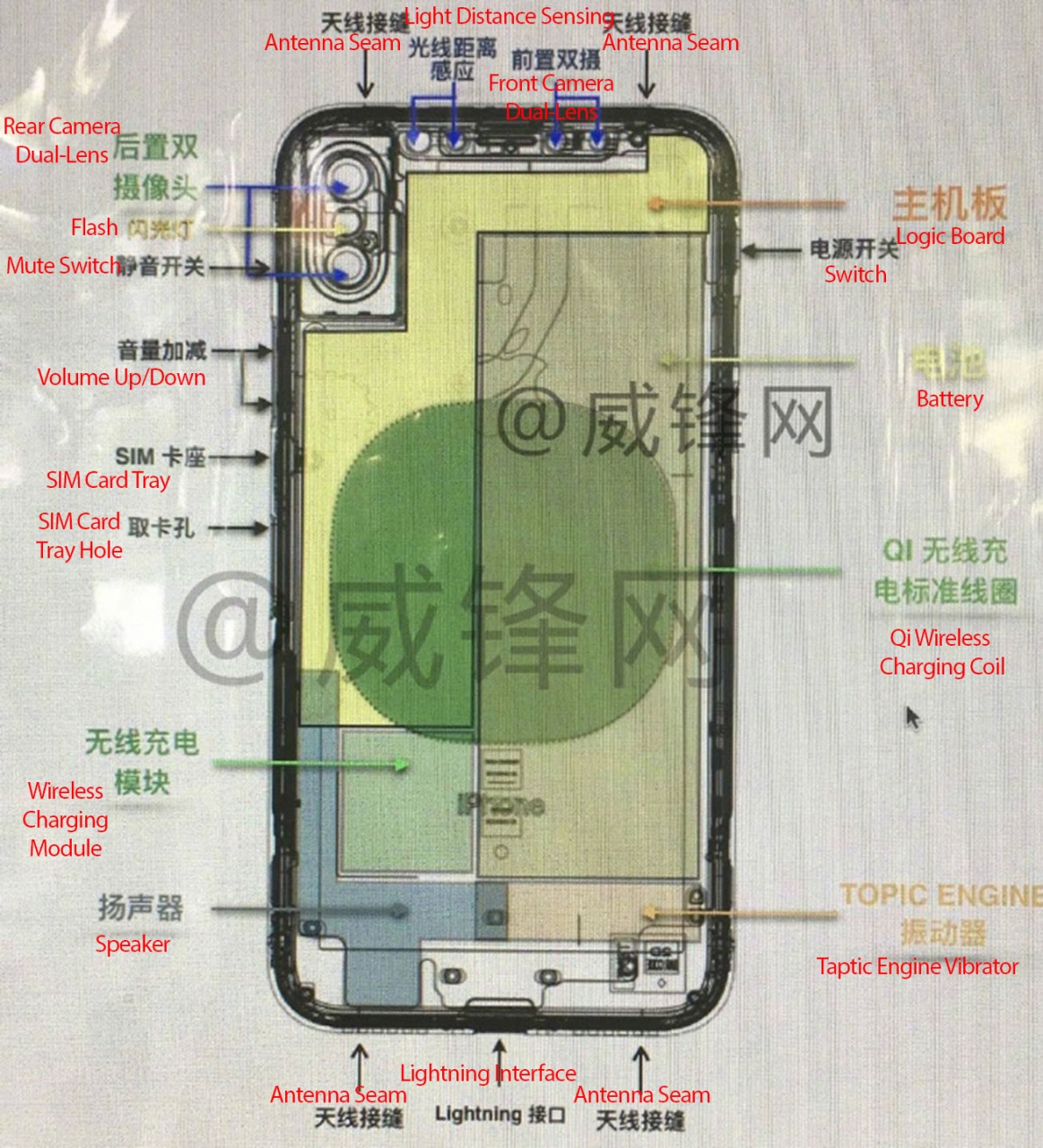 ภาพร่าง iPhone 8 ชุดนี้โพสต์โดย Wei Feng ผ่านเว็บไซต์ Weibo เป็นภาพร่าง iPhone 8 ที่มีการบรรยายส่วนประกอบภายในเป็นภาษาจีน (มีการแปลเป็นภาษาอังกฤษแล้ว) ไว้ดังรูป