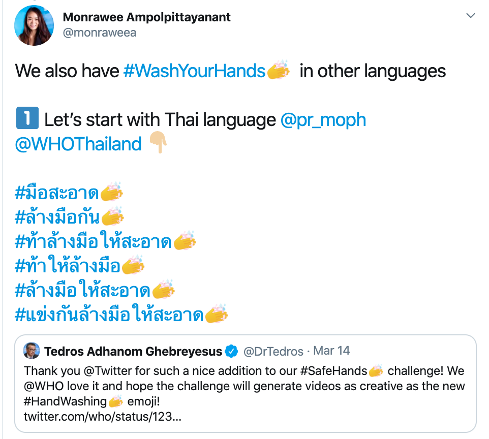 ทุก ๆ ครั้งที่ผู้ใช้ทวิตเตอร์ใช้แฮชแท็ก #SafeHands จะมีอีโมจินี้แสดงผลขึ้นบนระบบ Android และ iOS