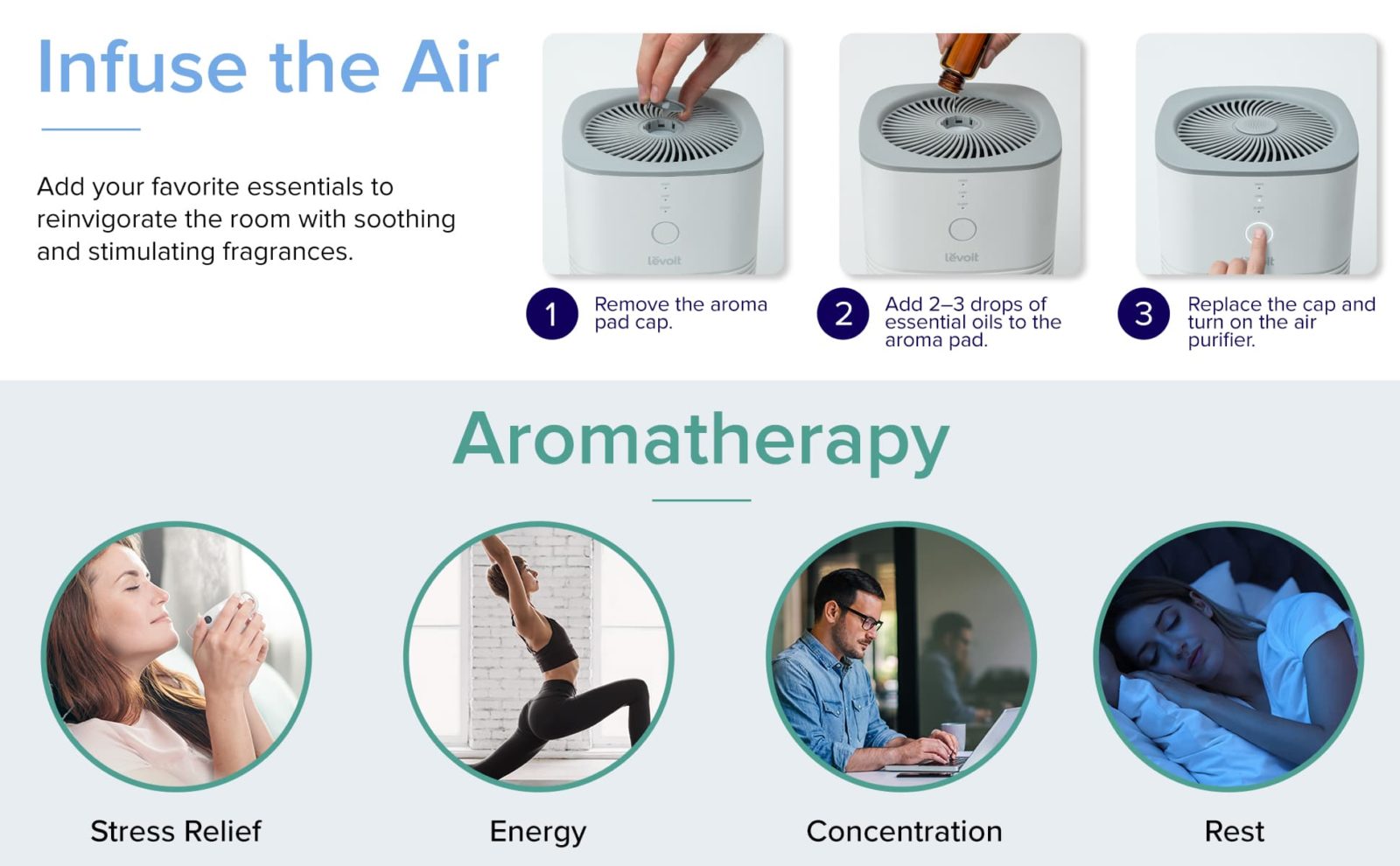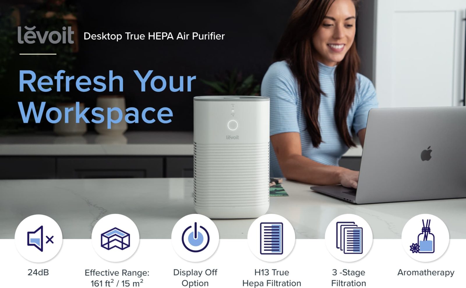 เครื่องฟอกอากาศ Levoit Desktop True HEPA จะมอบอากาศสดชื่นด้วยการกรอง 3 ขั้นตอน พร้อมทำให้พื้นที่ทำงานของคุณสดชื่นและอบอวลไปด้วยกลิ่นหอมแบบอะโรมาเพื่อสร้างบรรยากาศการทำงานให้ดีขึ้น