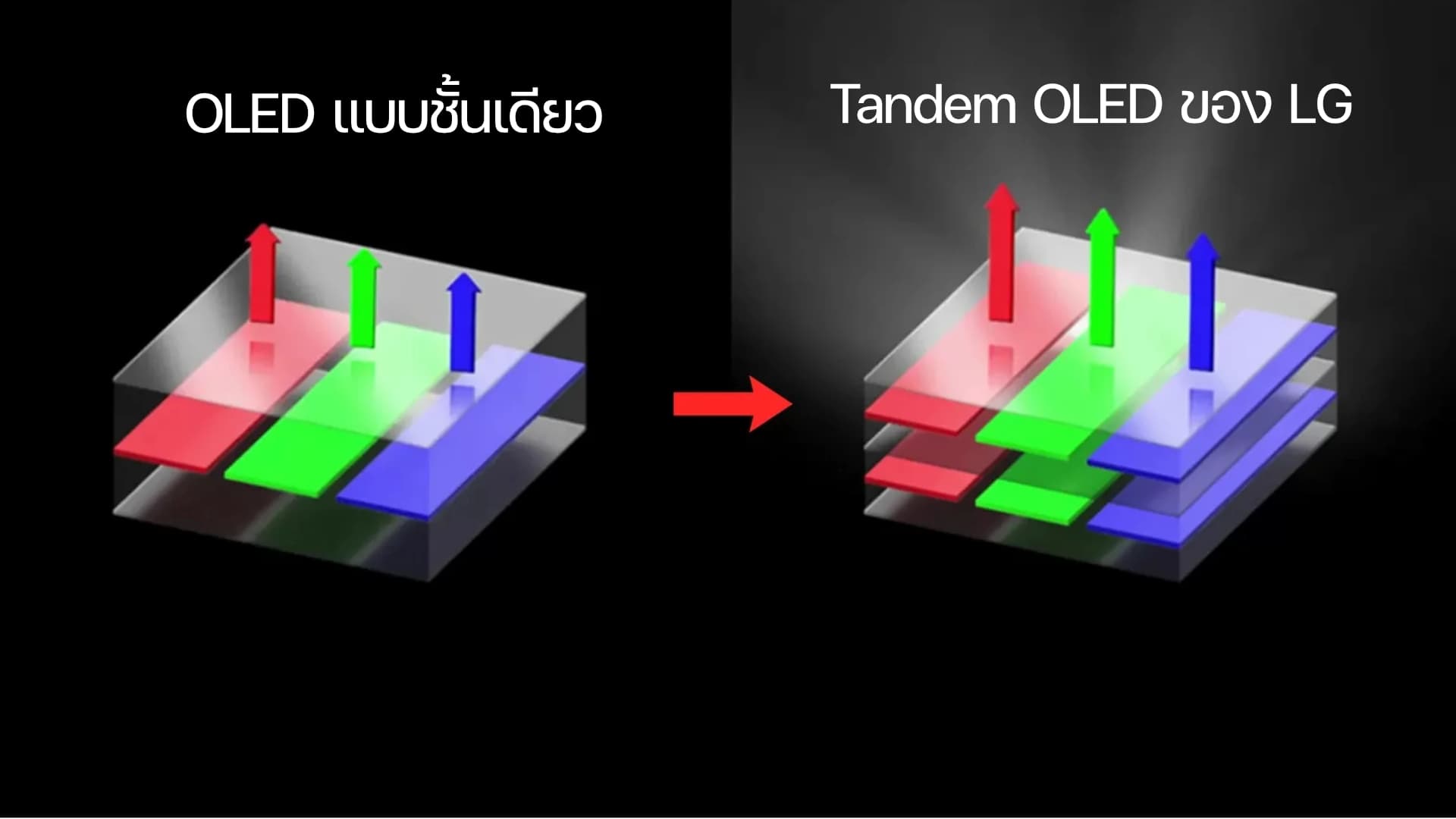 จอ OLED แบบ tandem นี้จะรวมเลเยอร์สีแดง เขียว และน้ำเงิน (RGB) สองชั้นเข้าด้วยกัน เพื่อให้ได้ระบบสีที่ทนทานและประสิทธิภาพดีกว่าพาแนล OLED แบบชั้นเดียวที่ใช้ใน iPhone รุ่นจอ OLED ของ Apple