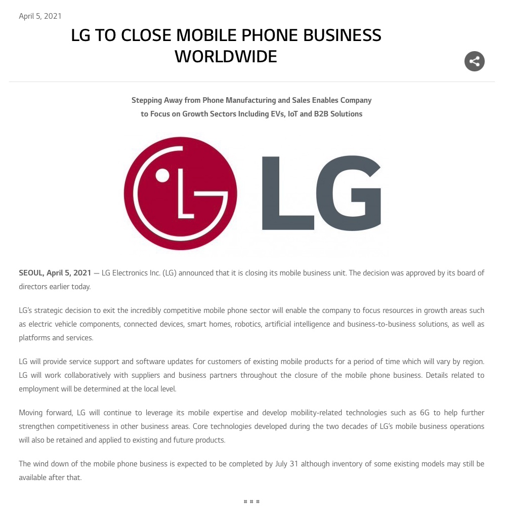 5 เม.ย. 2021, LG ได้ประกาศผ่านเว็บไซต์ว่าได้เลิกทำธุรกิจมือถือแล้วอย่างเป็นทางการ เนื่องจากอยู่การแข่งขันที่รุนแรง แต่ก็ยังสนับสนุนลูกค้าไปอีกสักระยะ