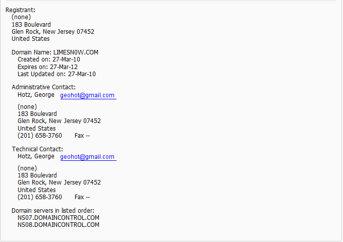 ล่าสุดมีการตรวจพบโดเมน limesn0w.com ซึ่งพบว่าเจ้าของโดเมนนั้นไม่ใช่ใครอื่นคือ Geohot นั่นเอง แถมจดวันเดียวกันกับ limera1n.com ด้วยนะ ซึ่งหากคาดเดาแล้วก็คงจะนึกออกว่า มันน่าจะเป็นเว็บที่บอกเรื่องราวเกี่ยวกับตัวปลดล็อค baseband ล่าสุดอยู่นั่นเอง