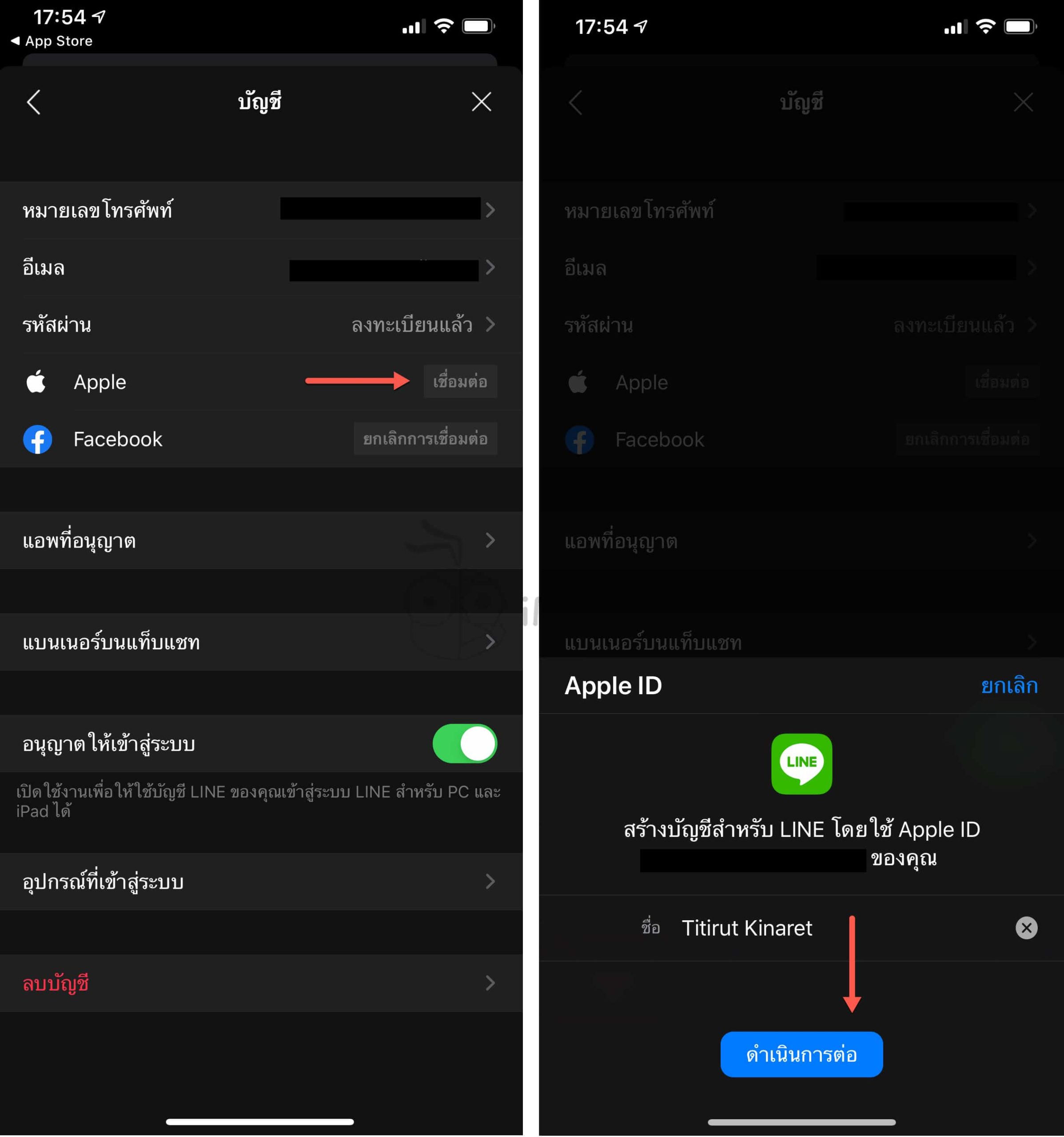 เลือก “เชื่อมต่อ” ตรง Apple ID > แตะ “ดำเนินการต่อ” > ยืนยันตัวตนให้เรียบร้อย