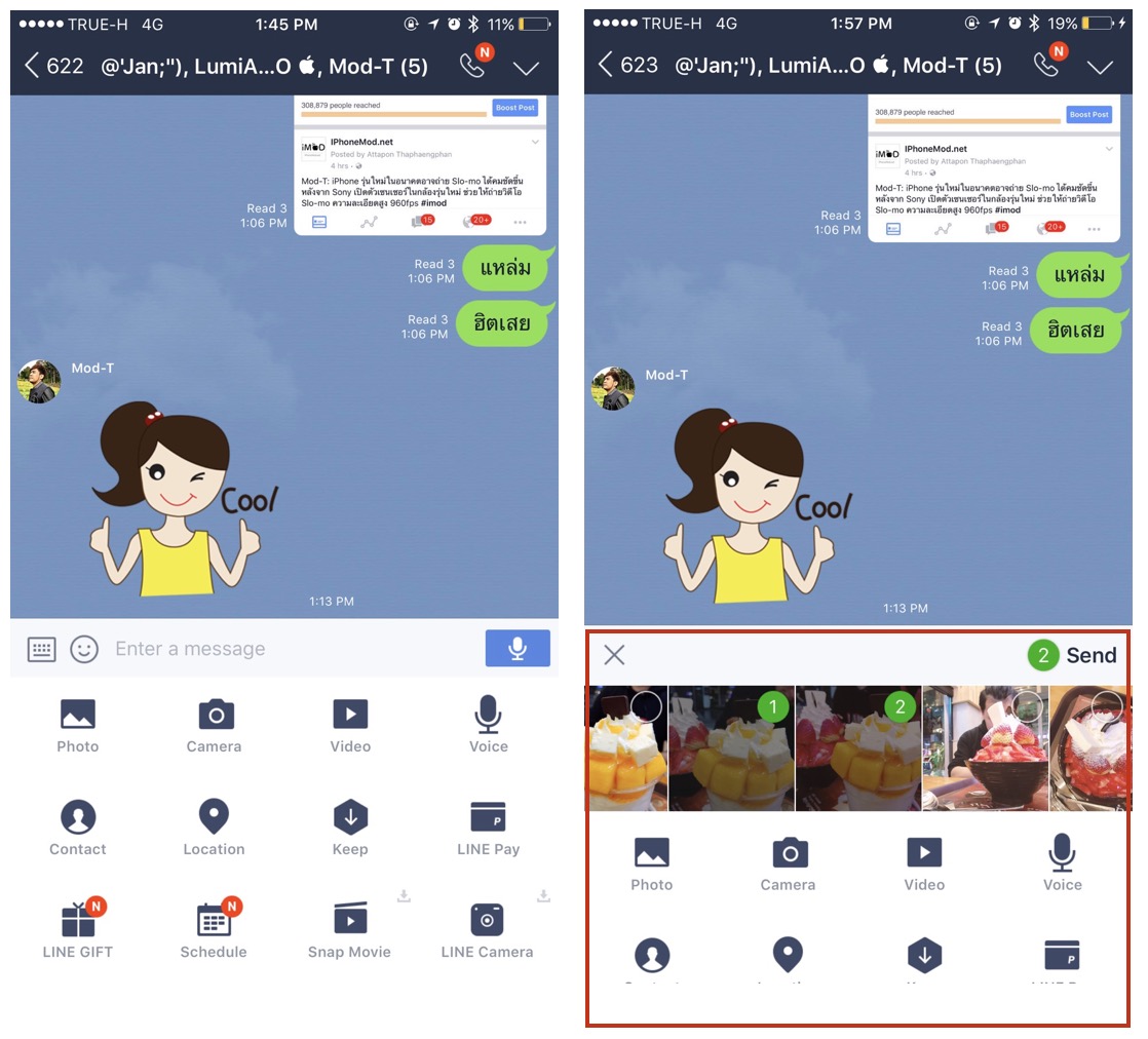 รูปและวิดีโอสามารถพรีวิวได้จากหน้าต่างเล็กๆ ด้านล่างหลังจากกด + เพื่อจะส่งรูปได้เลย ต่างจากแบบเดิมที่ต้องเปิดหน้าแสดงรูปและวิดีโอขึ้นมาก่อน