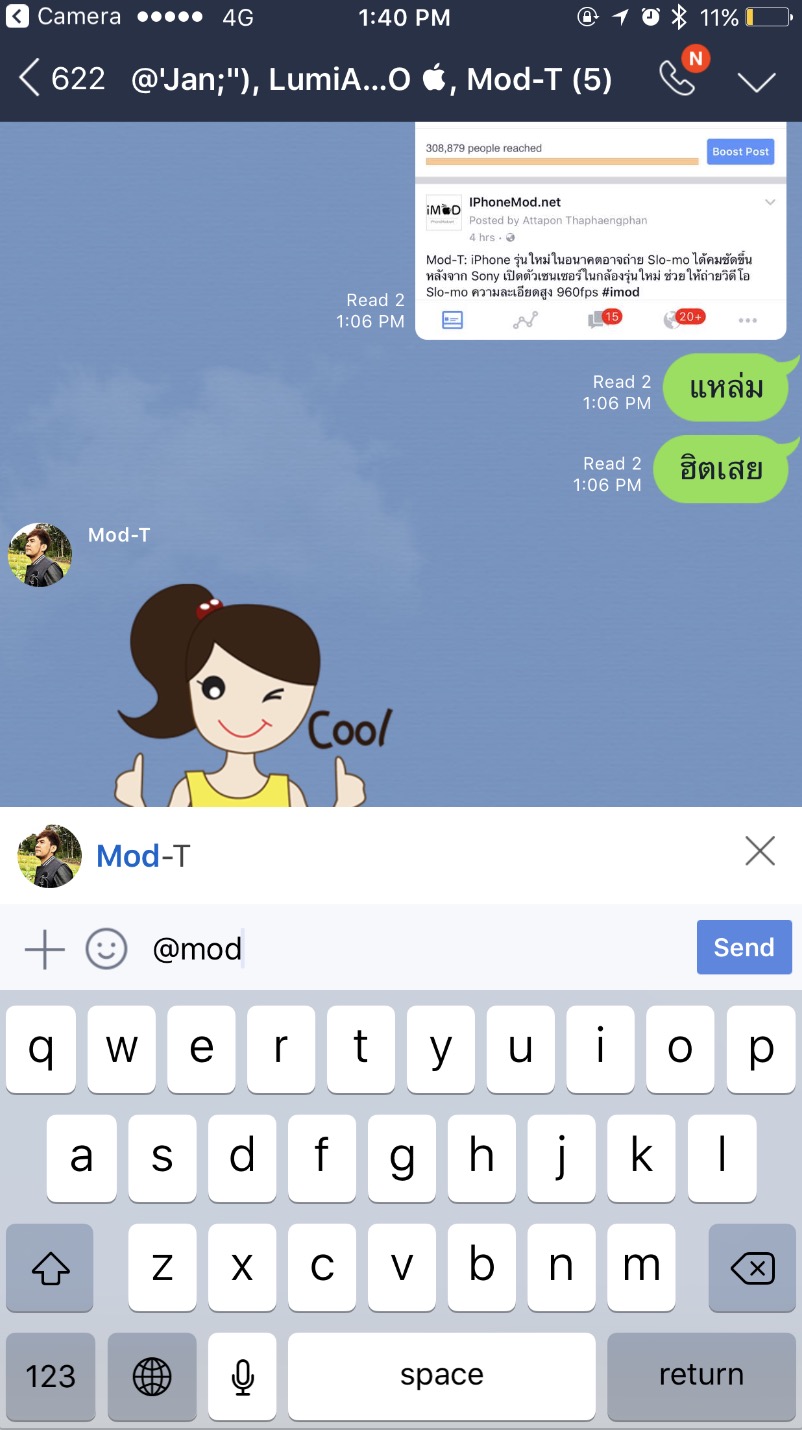 ที่เพิ่มอีกคือเราสามารถ mention ชื่อเพื่อนที่คุยกันในกลุ่มหลายๆ คนได้ โยชน์คคือจะได้รู้ว่าคนนี้พูดประโยคนี้กับใครโดยเฉพาะหรือเปล่า วิธีการใส่ mention ก็เพียงพิมพ์ @หน้าชื่อผู้ใช้ในกลุ่ม
