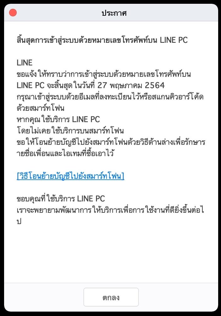 LINE ออกประกาศผ่านแอปบนคอม (PC) ว่า การเข้าสู่ระบบ (Log in) ด้วยหมายเลขโทรศัพท์นั้นจะไม่สามารถใช้งานได้ตั้งแต่ 27 พ.ค. 64 เป็นต้นไป