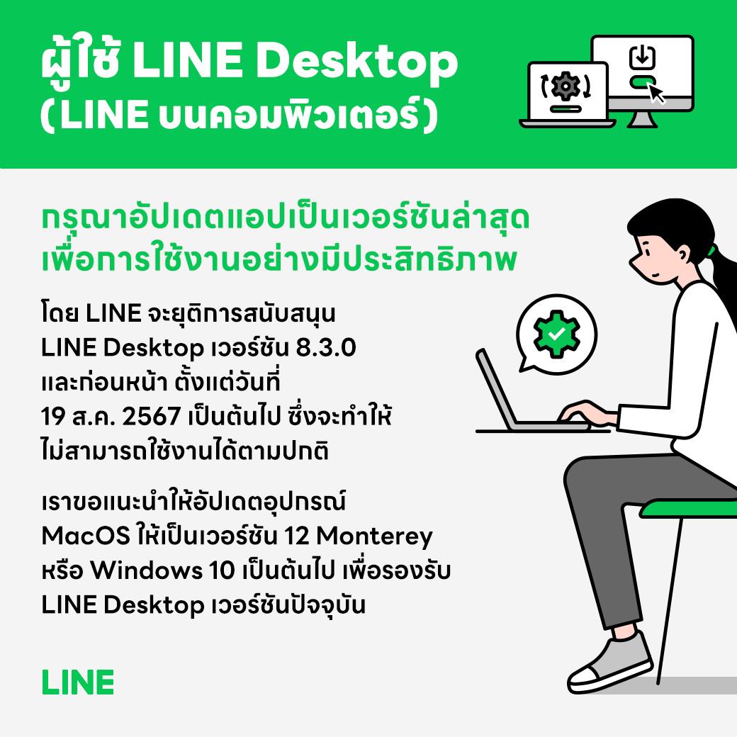 ตั้งแต่วันที่ 19 ส.ค. 2567 เป็นต้นไป LINE Desktop เวอร์ชัน 8.3.0 และก่อนหน้านี้ จะไม่สามารถใช้งานได้ตามปกติ