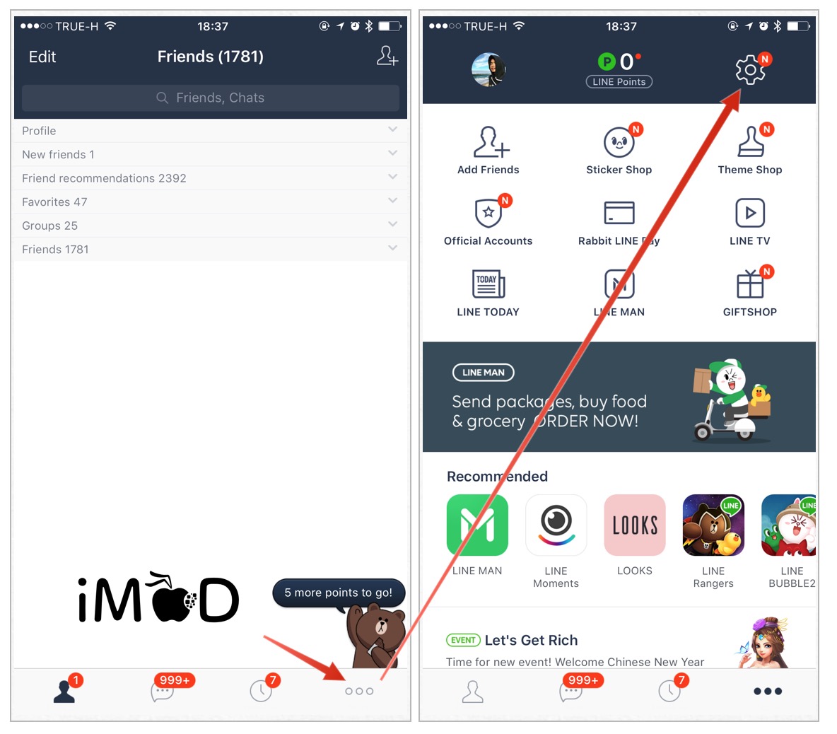 ไปที่แท็บ More หรือ … ที่ล่างขวา เลือก Settings. (การตั้งค่า) ไอคอนรูปฟันเฟือง(เกียร์)ด้านบนขวา
