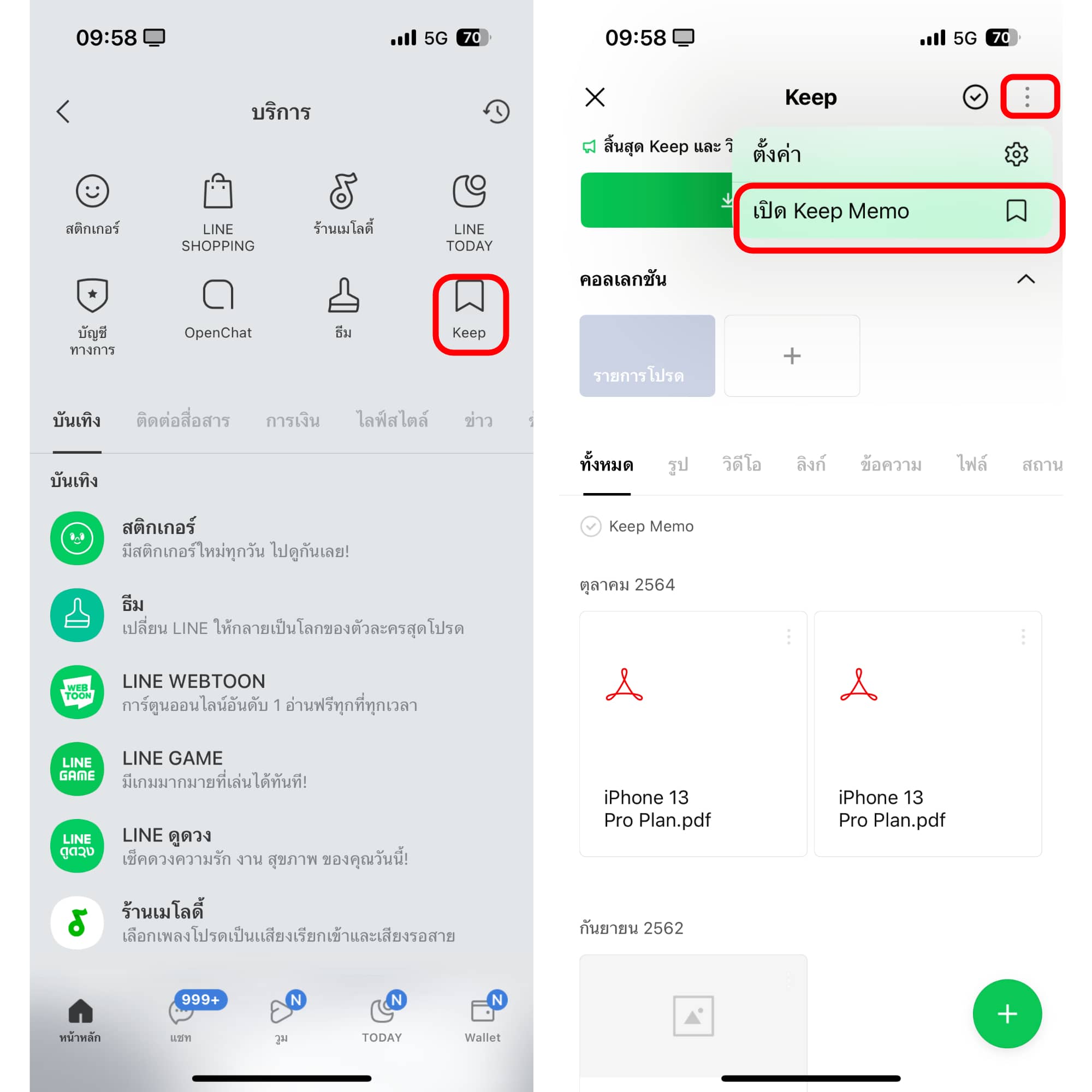 เข้ามาที่ Line จากนั้นไปที่ หน้าหลัก > บริการ > ไอคอน Keep > จุดสามจุด > เปิด Keep Memo