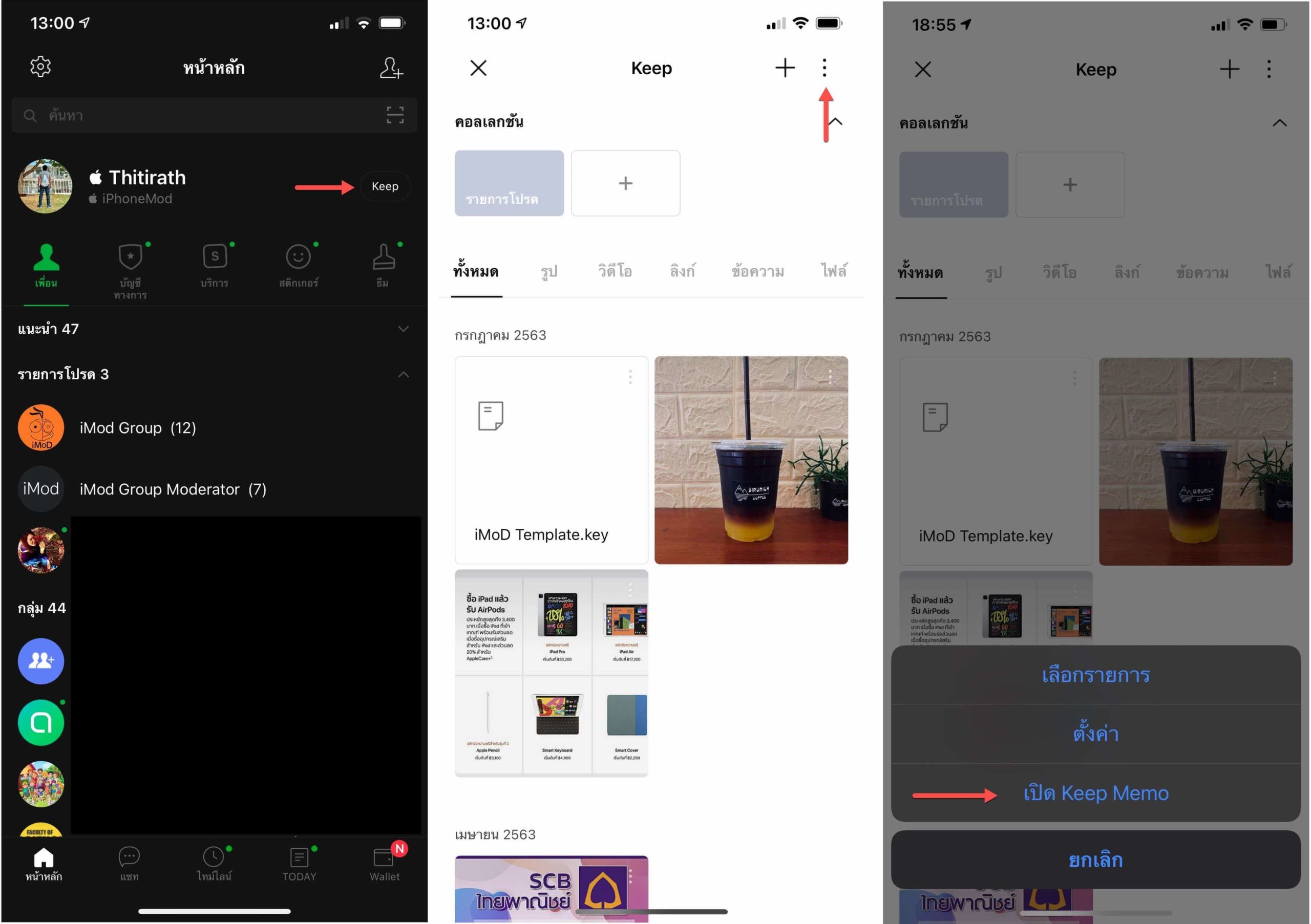 หากหาห้องแชทไม่เจอก็เข้าไปที่แถบแรก > Keep > จุด 3 จุด > เปิด Keep Memo