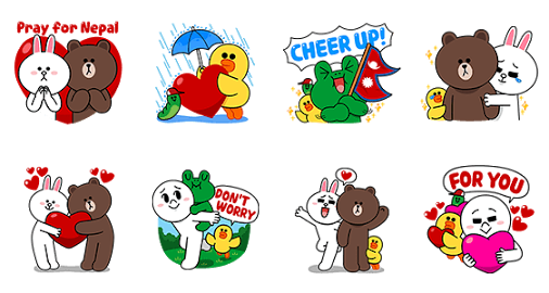 LINE เปิดตัวสติ๊กเกอร์ Pray for Nepal ช่วยเหลือผู้ประสบภัยแผ่นดินไหวใน เนปาล (Nepal) เช่นเดียวกับก่อนหน้านี้ที่มีสติ๊กเกอร์ลายพิเศษ Pray for the Philippines เพื่อช่วยเหลือเหยื่อไต้ฝุ่นไห่แย่นในฟิลิปปินส์