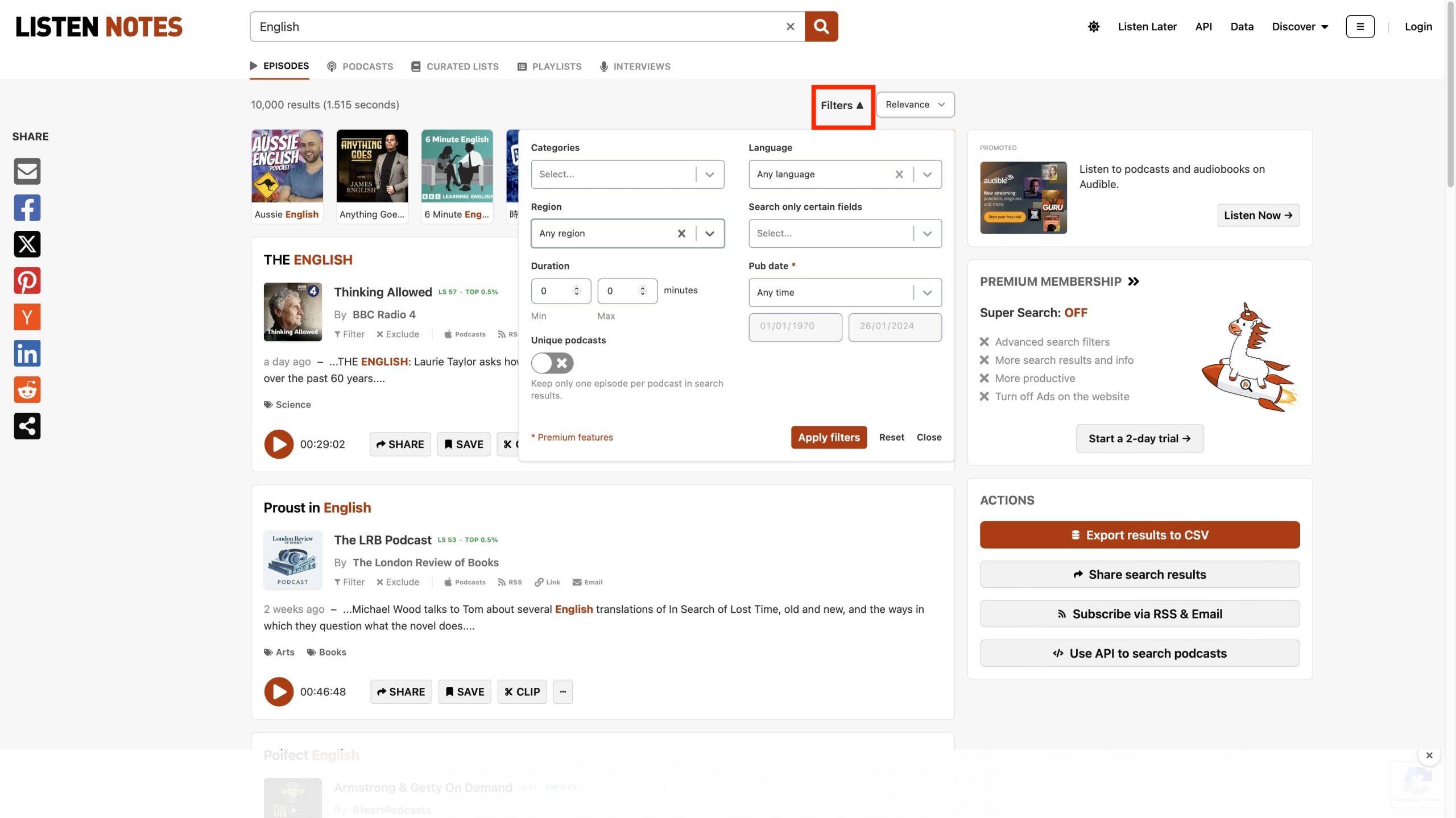 แล้วถ้าเราเลือก Fliters ยังสามารถเลือกประเทศ และอื่น ๆ ของ Podcast เพิ่มเติมได้ด้วยนะ