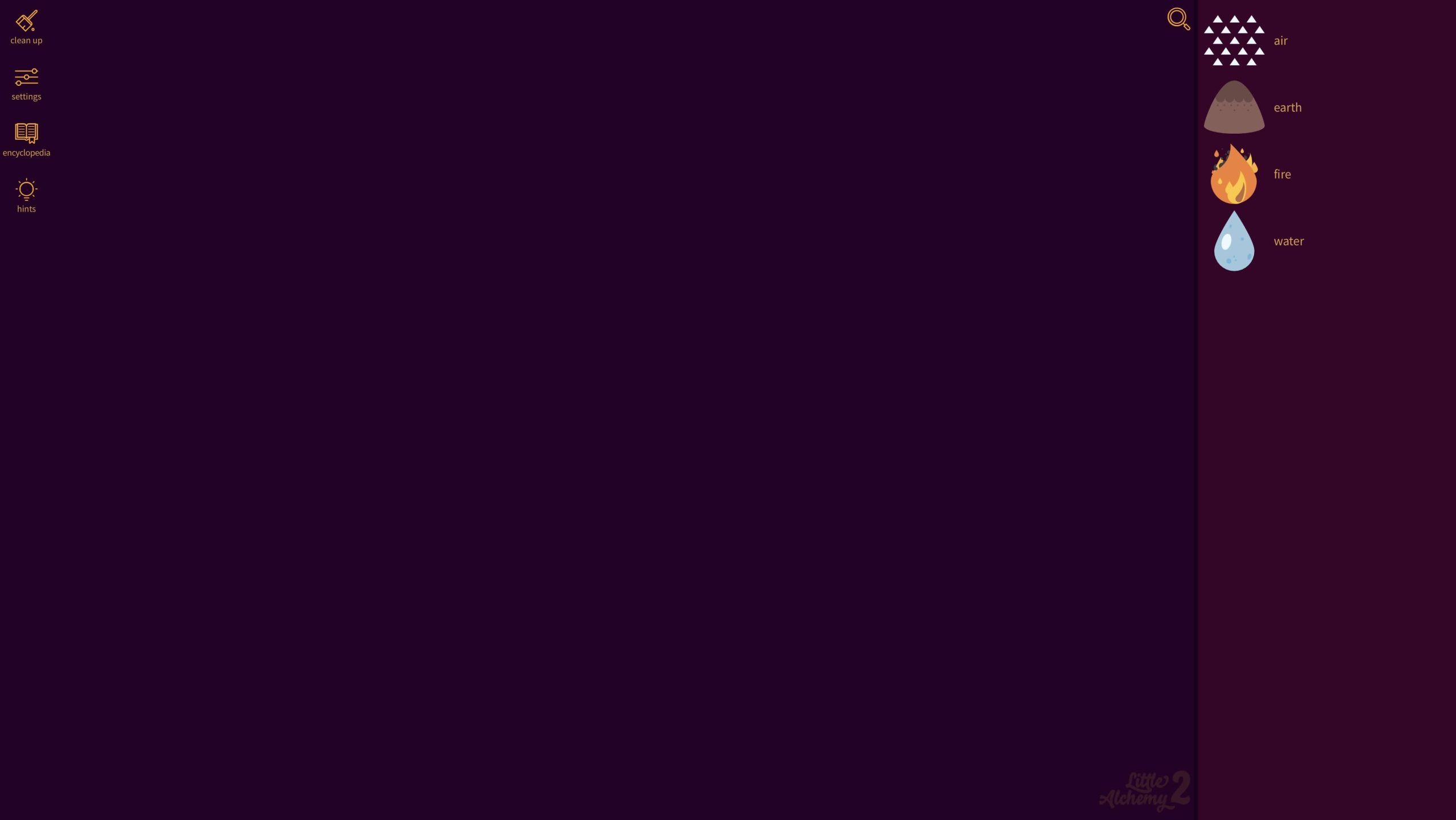 มาที่เว็บ Little Alchemy 2 หน้าเว็บจะเป็นหน้าโล่ง ๆ แล้วมีสารต่าง ๆ คือ Air, Eatrh, Fire, Water