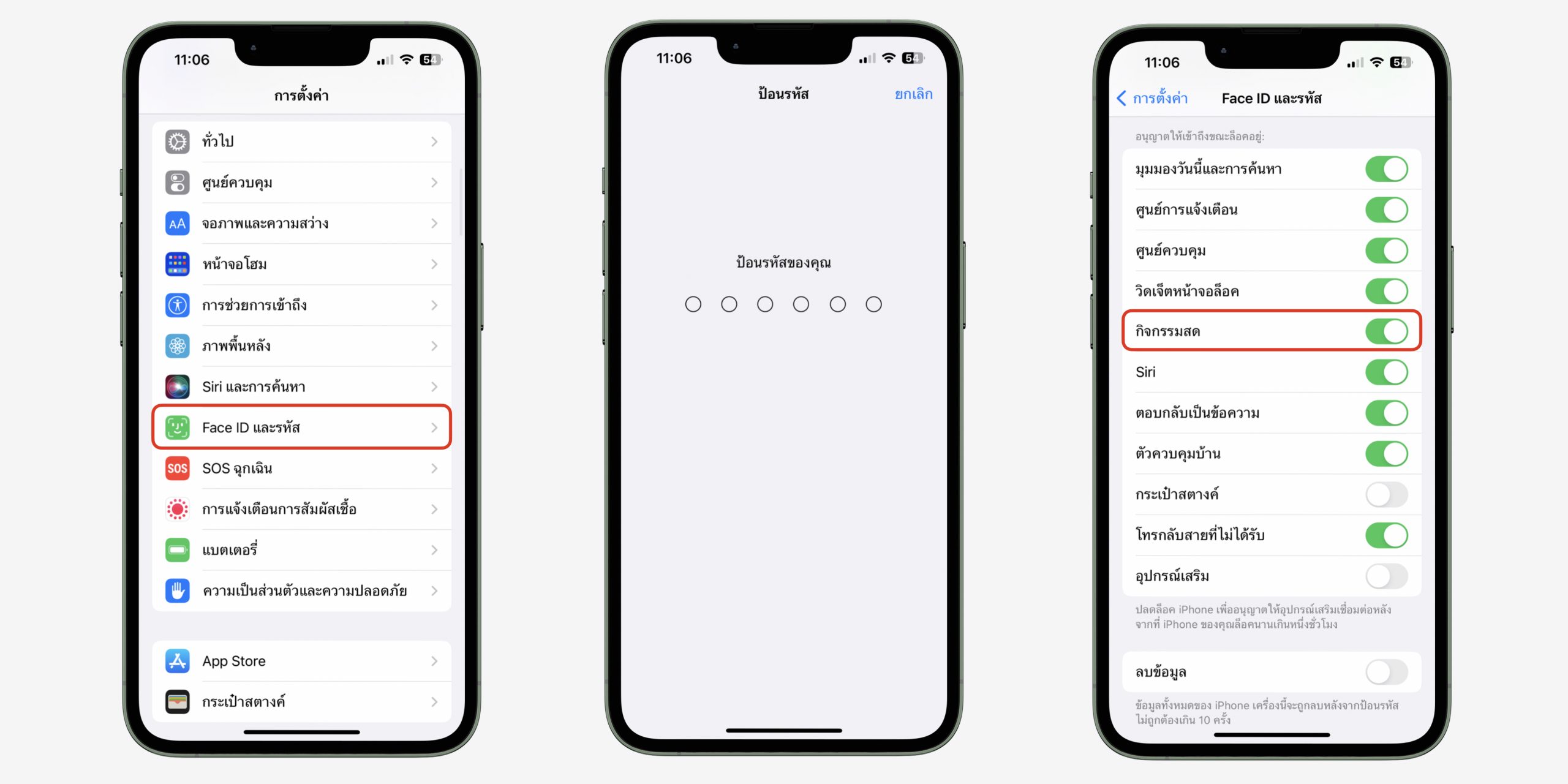 เราสามารถตรวจสอบว่า iPhone ของเราเปิดใช้งาน Live Activities แล้วหรือไม่ ? โดยเข้ามาที่ การตั้งค่า > Face ID และ รหัส > ป้อนรหัส iPhone > เลื่อนลงมาด้านล่างจะเจอคำว่า “กิจกรรมสด” ในหมวด อนุญาตให้เข้าถึงขณะล็อคอยู่