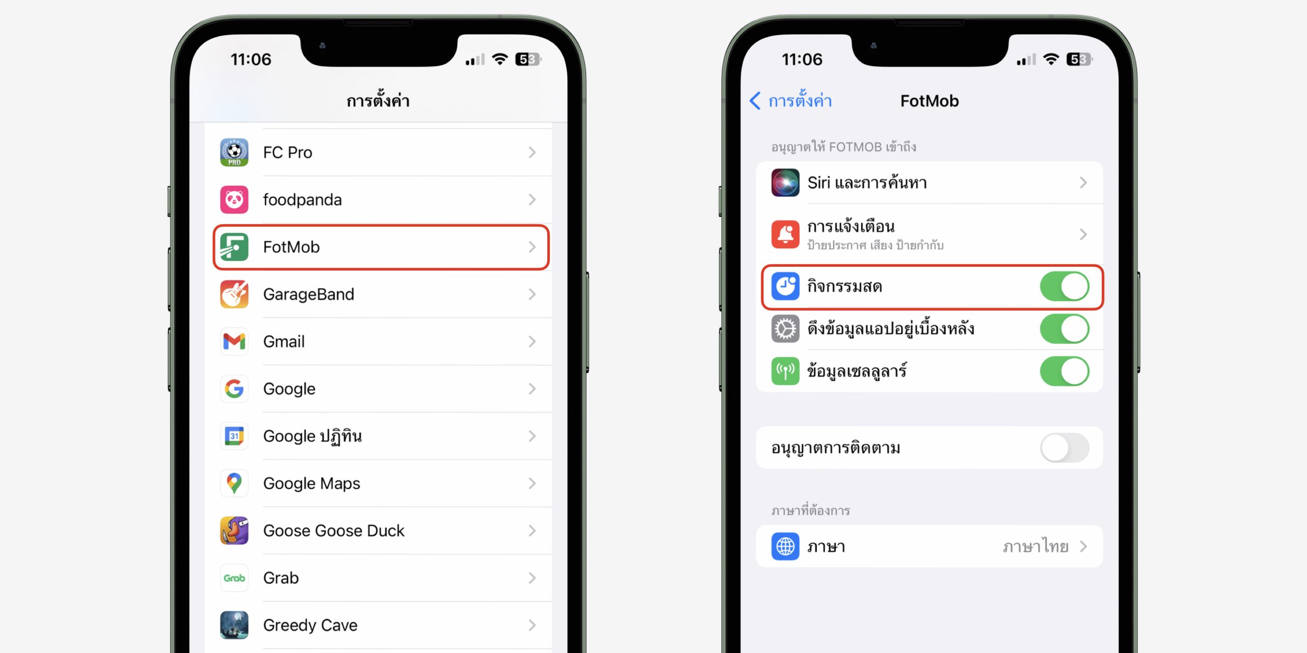 และเราสามารถเข้าไปเช็คดูแอปพลิเคชันต่าง ๆ ได้ด้วยว่าแอปนั้น ๆ รองรับฟีเจอร์ Live Activities ด้วยหรือไม่ โดยให้เราเข้ามาที่ การตั้งค่า > เลือกแอปพลิเคชันที่ต้องการตรวจเช็ค > หากแอปพลิเคชันไหนรองรับ จะแสดงหัวข้อ “กิจกรรมสด” ขึ้นมาให้เห็น