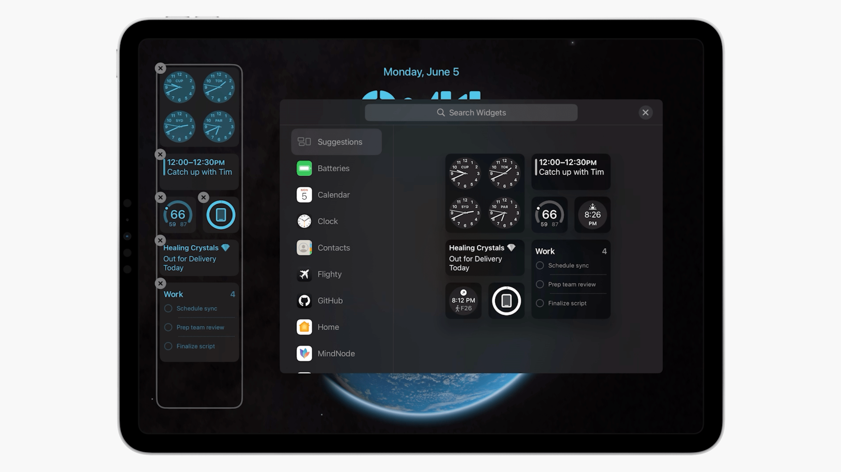 สำหรับวิดเจ็ตบนหน้าจอล็อคของ iPadOS 17 จะย้ายไปอยู่ด้านซ้ายของหน้าจอ ซึ่งสามารถเลือกเพิ่มวิดเจ็ตจากแอปต่าง ๆ ได้มากกว่าเดิม นอกจากนี้ก็ยังสามารถสร้างหน้าจอล็อคแบบหลายหน้าจอ และเชื่อมโยงเข้ากับโหมดโฟกัสได้ด้วย ส่วนการแจ้งเตือนต่าง ๆ ที่แสดงบนหน้าจอล็อคก็ถูกปรับให้แสดงที่แถบด้านล่างเหมือน iPhone เช่นกัน