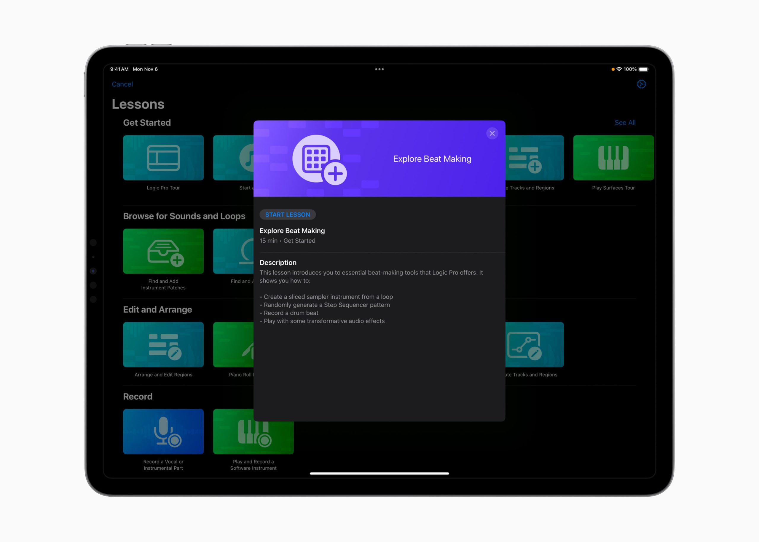 ส่วน Lessons ที่ได้รับความนิยมภายในแอป Logic Pro ก็มีบทเรียนใหม่ ๆ ครอบคลุมหลายหัวข้อเรื่องอย่าง Mastering Assistant, Sample Alchemy, Beat Breaker, การทำจังหวะ, ระบบอัตโนมัติ, แพ็คเสียง และ Play Surfaces ในขณะที่แพ็คเสียง Hybrid Textures ก็มาอยู่บน Logic Pro สำหรับ iPad ด้วยเช่นกันเพื่อให้ศิลปินมีสารตั้งต้นใหม่ ๆ ในการสำรวจขุมพลังและความล้ำลึกของ Sample Alchemy
