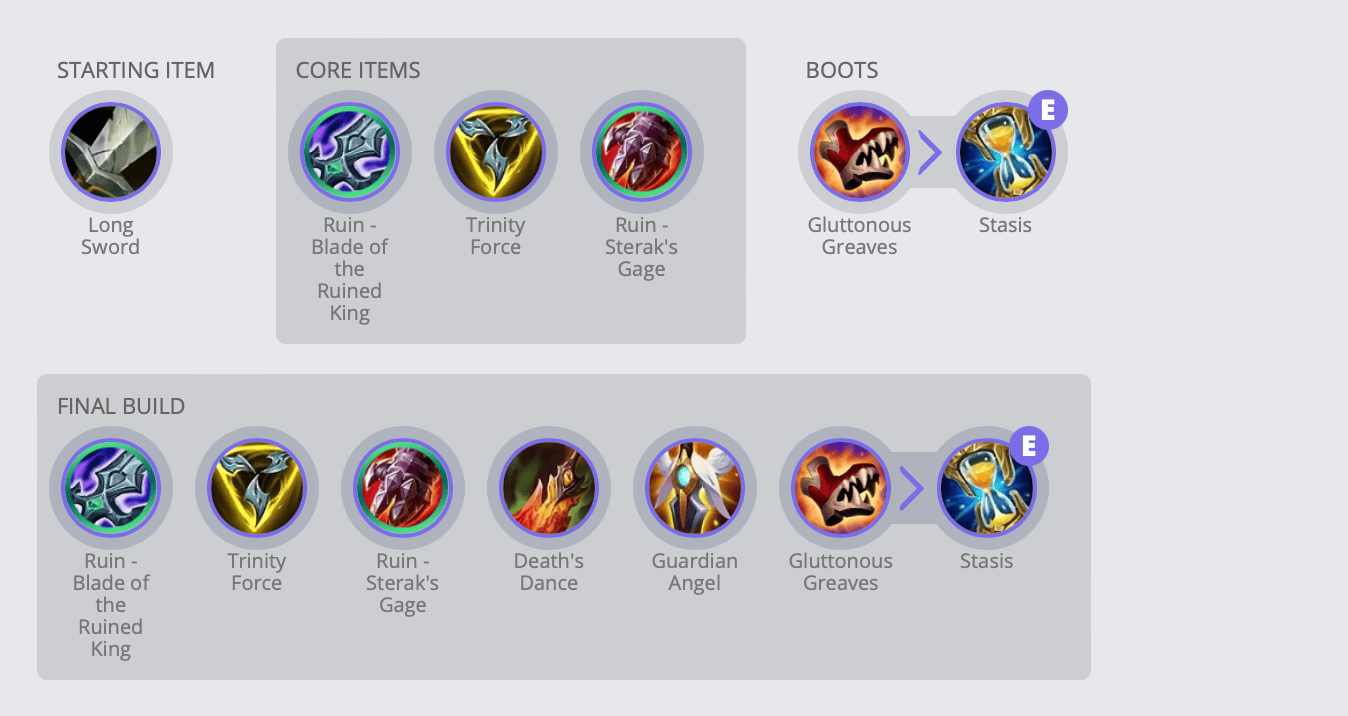 Viego เป็นตัวที่ออกของAD และไอเทมแทงค์ ทำให้สามารถรับความเสียหายเเละเอาตัวรอดได้เอง Trinity Force เป็นItemแรกที่แนะนำ เพราะได้รับความเร็วเคลื่อนที่เพิ่งขึ้นและความเสียหายในการโจมตีเพิ่มขึ้น Trinity Force Blade of the Ruined King ก็เป็นอีกหนึ่งitemที่น่าสนใจสามารถนำมาคอมโบกับ Passive ได้ทำให้สร้างความเสียหายได้เพิ่มมากขึ้น