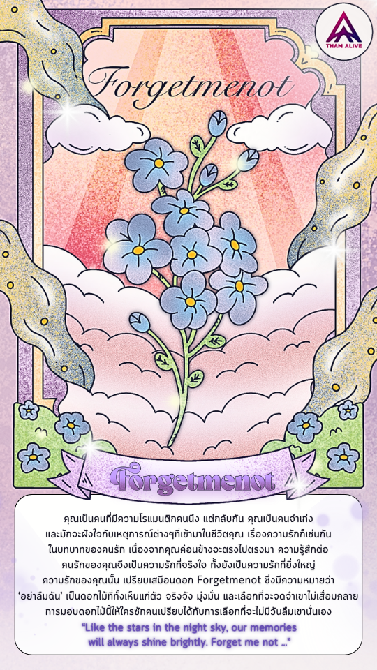 เมื่อการเดินทางสิ้นสุดลง เราก็จะพบกับดอกไม้ที่เหมาะกับตัวตนเรา และเป็นตัวแทนสื่อถึงนิยามความรักภายในจิตใจของเรานั่นเอง ผู้เขียนได้ดอก Forgetmenot แล้วเพื่อนๆ ล่ะ ได้ดอกไม้อะไรกัน ลองเล่นแล้ว.. อย่าลืมเอามาแชร์กันนะคะ 😊