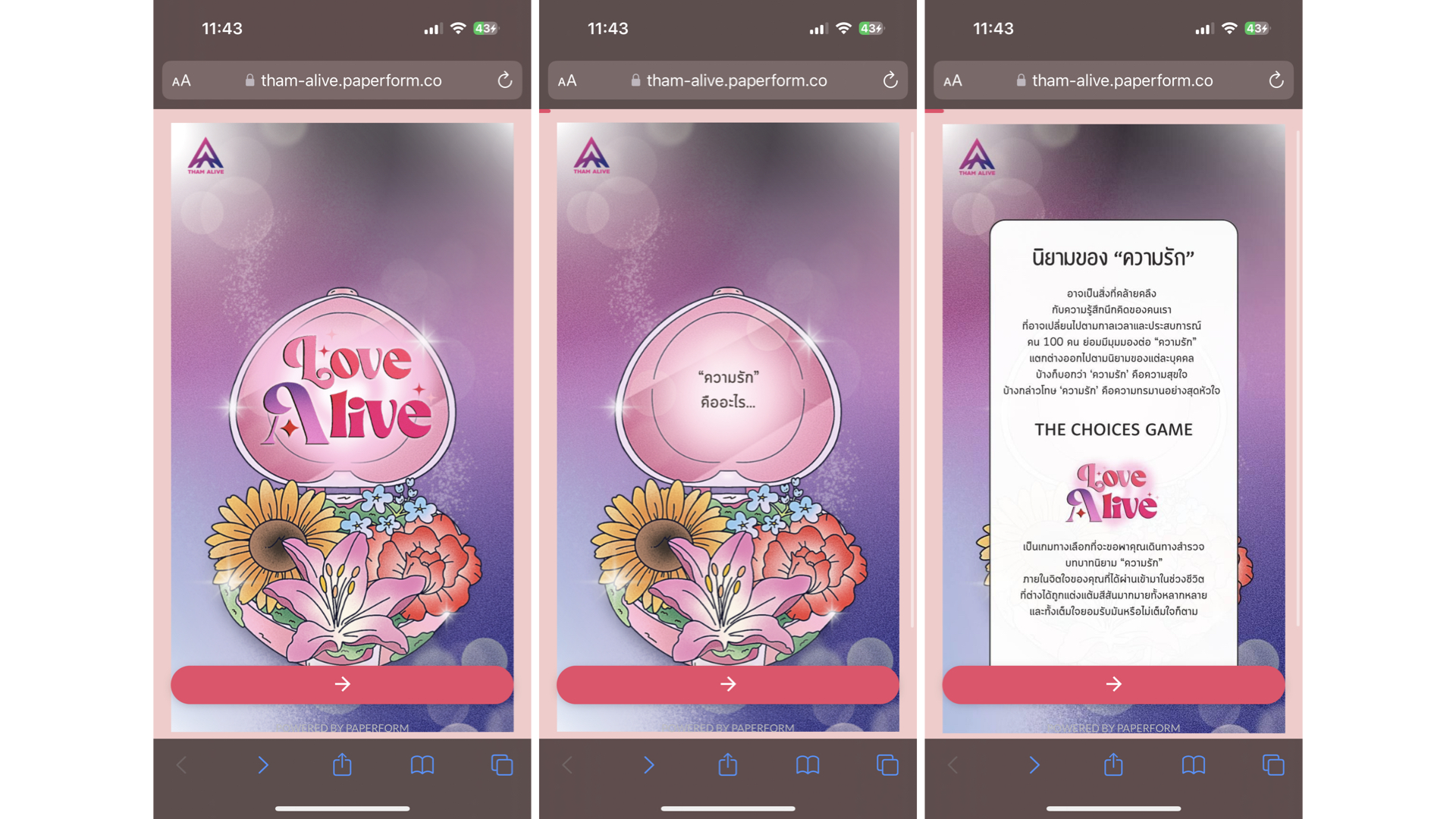 ถ้าพร้อมแล้วมาสำรวจนิยามความรักของตัวเองโดยคลิกที่ลิงค์นี้ 👉love Alive จากนั้นแตะที่ลูกสอนถัดไปเพื่อนำตัวเองเข้าสู่เนื้อเรื่องในเกม ลุยเลย!