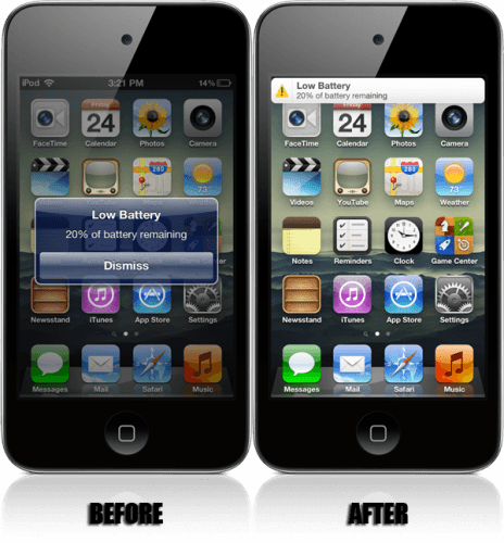 ปกติแล้วเมื่อเราใช้ iPhone จนแบตเตอรี่น้อยกว่า 20% จะมีการเตือนแบบ Alert ขึ้นมากลางจอ ซึ่งก็เหมือนกับ Notification รุ่นเก่าก่อนจะเป็น iOS 5 ซึ่งทำให้บางคนที่กำลังเล่นเกมหรือทำอะไรอยู่อาจจะเกิดอารมณ์หงุดหงิดได้