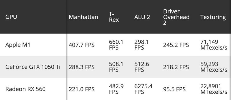 เมื่อผ่านการทดสอบโดย GFXBench 5.0 พบว่า Metal API ของ ชิป M1 มีคะแนนสูงกว่า GeForce GTX 1050 Ti, AMD Radeon RX 560