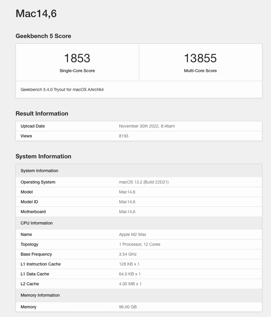 คะแนน Geekbench 5 ชิป M2 Max ที่เผยออกมานั้นเป็นคะแนนทดสอบบน Mac รหัส Mac14,6 มาพร้อม CPU 12-core, RAM 96GB คาดว่าเป็น Mac Studio รุ่นใหม่ที่รุ่นชิป M1 Ultra สามารถเพิ่ม RAM ได้สูงสุดที่ 128GB