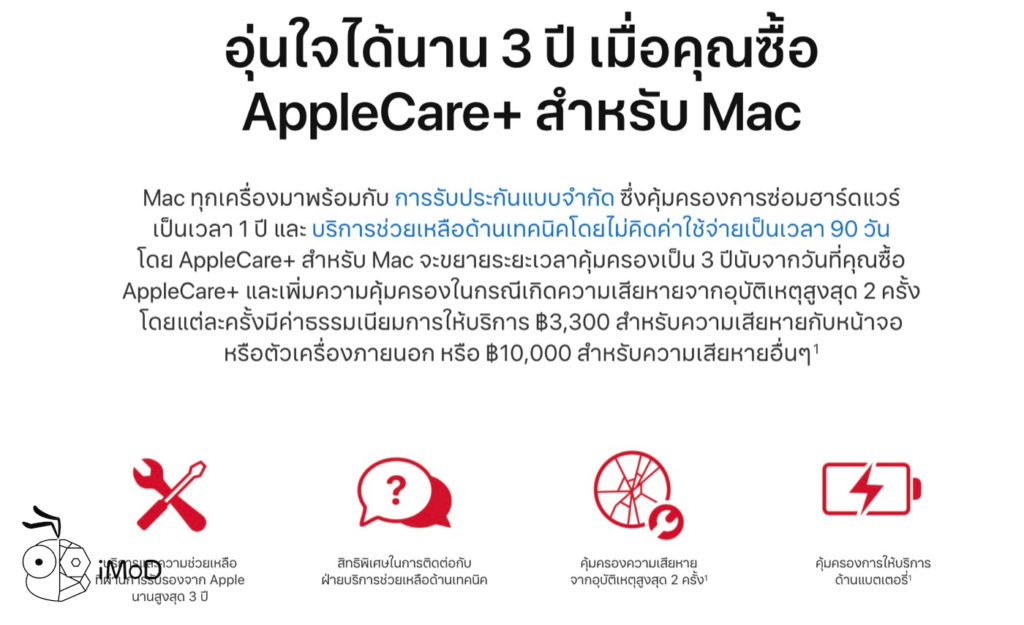 AppleCare+ สำหรับ Mac จะขยายระยะเวลาคุ้มครองเป็น 3 ปีนับจากวันที่ซื้อเครื่องและเพิ่มความคุ้มครองในกรณีเกิดความเสียหายจากอุบัติเหตุสูงสุด 2 ครั้ง โดยแต่ละครั้งมีค่าธรรมเนียมการให้บริการ 3,300 บาทสำหรับความเสียหายกับหน้าจอหรือตัวเครื่องภายนอก หรือ 10,000 บาทสำหรับความเสียหายอื่น ๆ