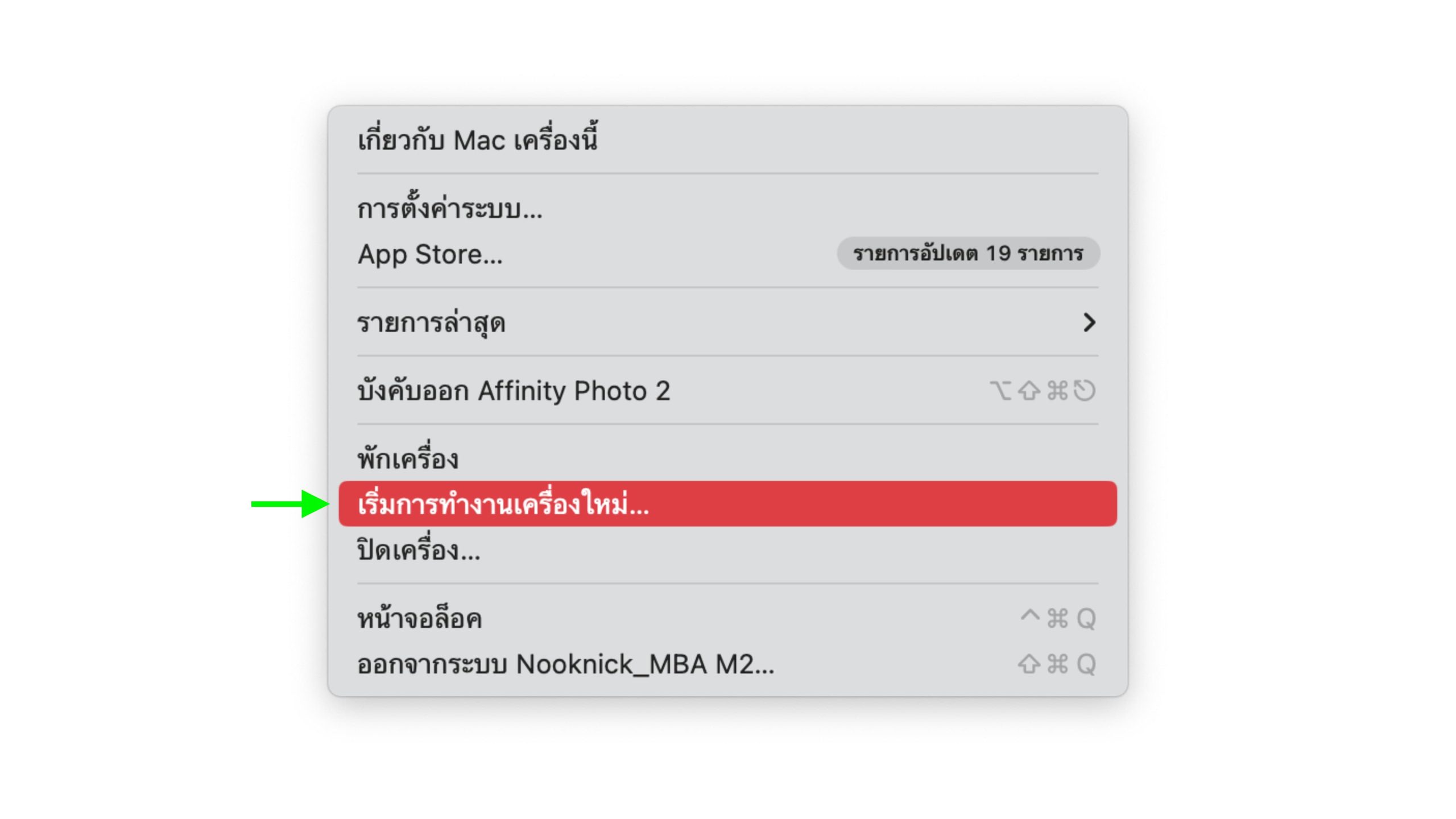 วิธี Restart เครื่อง ให้คลิกที่สัญลักษณ์รูป ที่มุมบนซ้าย > เลือก เริ่มการทำงานเครื่องใหม่…
