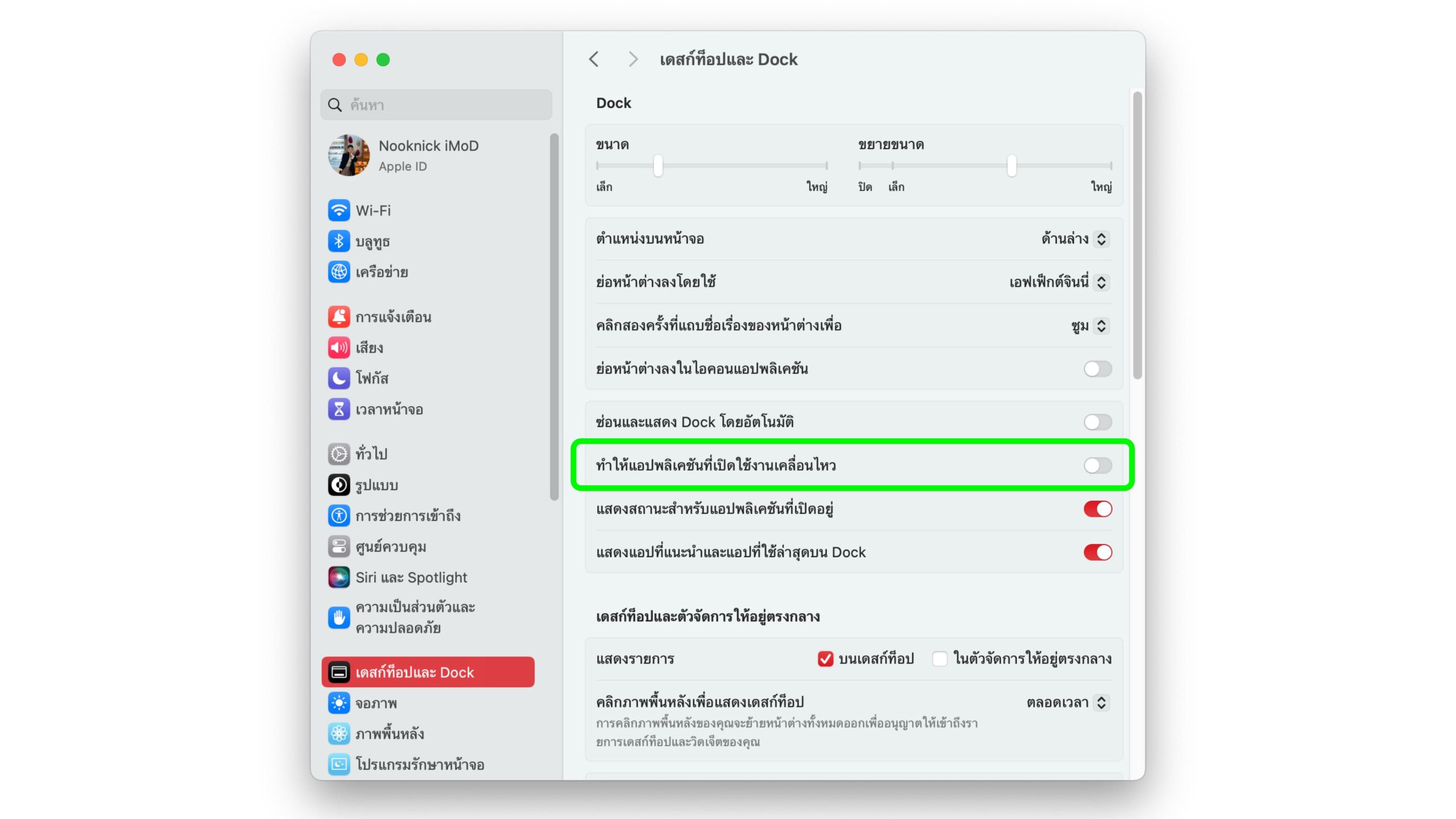 วิธีตั้งค่า ให้ไปที่ การตั้งค่าระบบ > เดสก์ท็อปและ Dock > ปิด “ทำให้แอปพลิเคชันที่เปิดใช้งานเคลื่อนไหว”