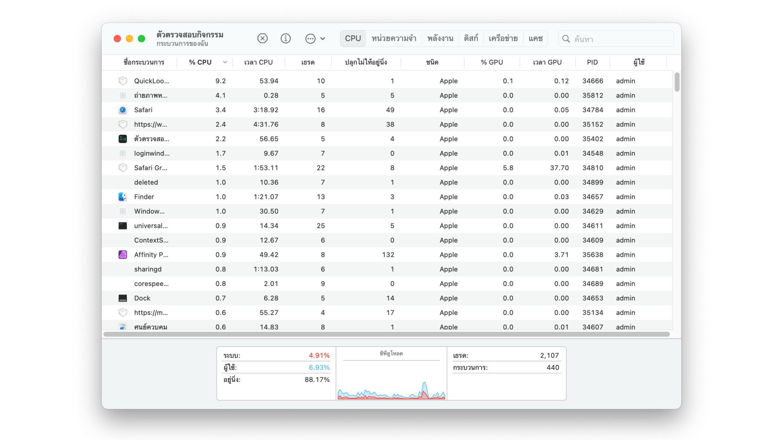 - คำแนะนำ : ตรวจสอบการใช้หน่วยความจำในแอป “ตัวตรวจสอบกิจกรรม” บน Mac จะมีการบอก % การใช้งาน CPU ของแต่ละแอปอยู่ ลองสังเกตว่าแอปไหนใช้ CPU เยอะบ้าง