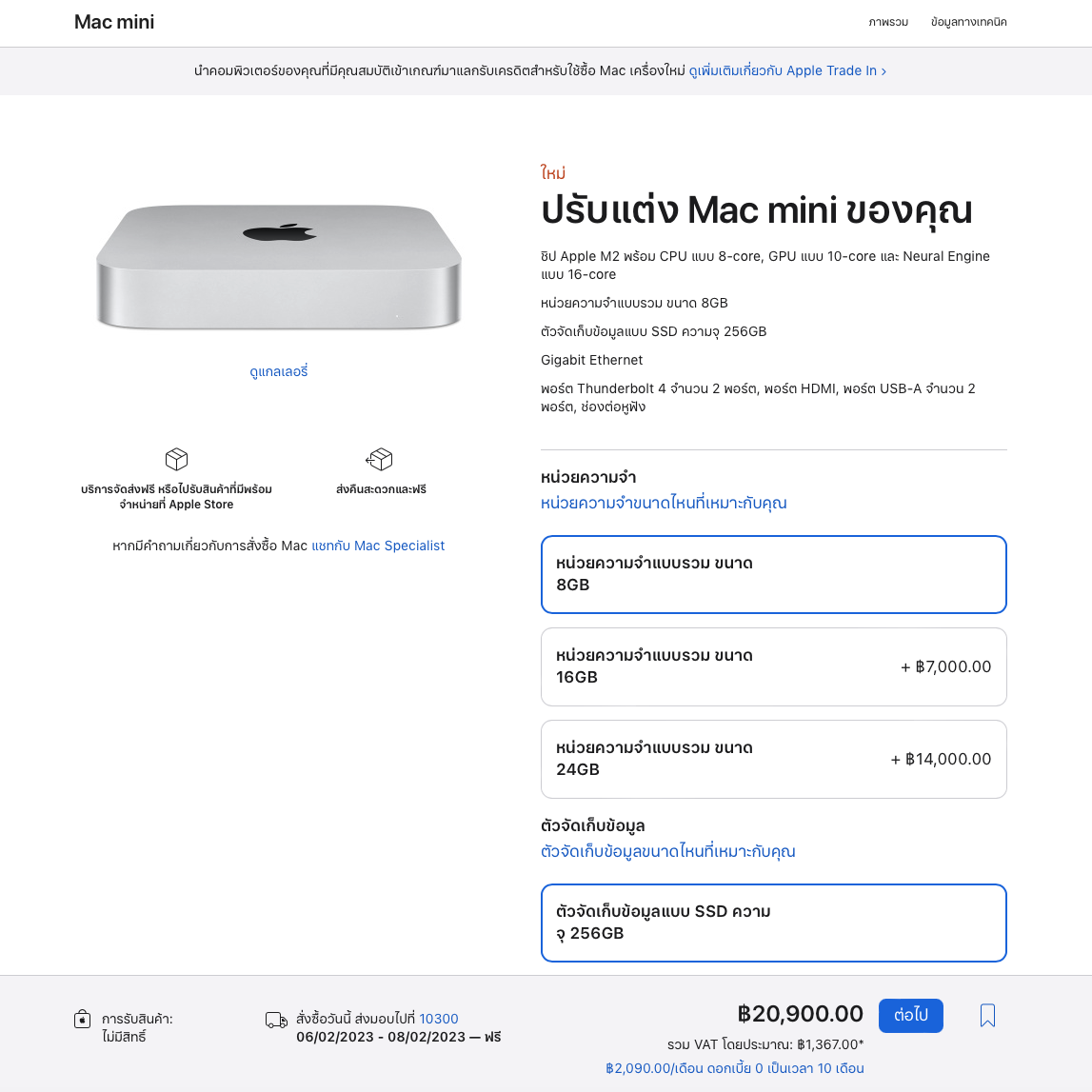 - Mac mini ชิป M2 RAM 8GB, SSD 256GB ราคา ฿20,900