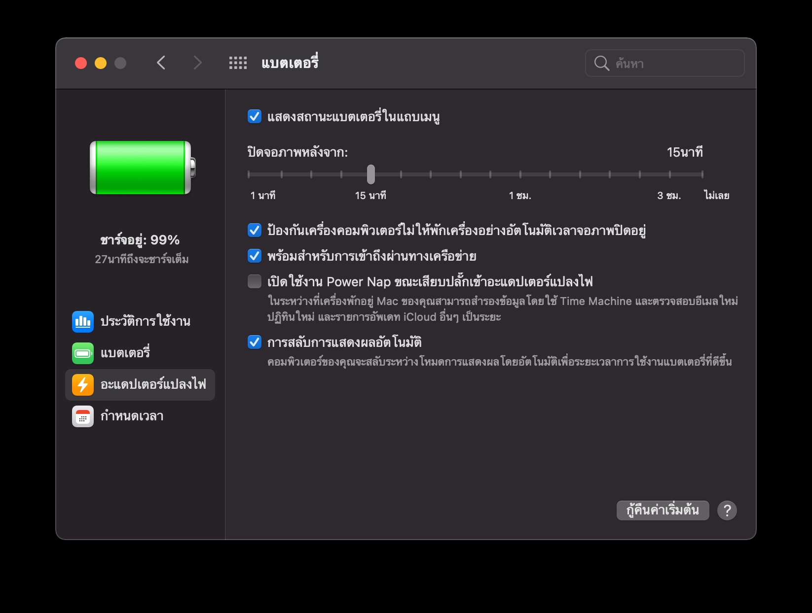 ไปที่การตั้งค่า > แบตเตอรี่ > อะแดปเตอร์แปลงไฟ > เปิด “ป้องกันเครื่องคอมพิวเตอร์ไม่ให้พักเครื่องอย่างอัตโนมัติเวลาจอภาพปิดอยู่”