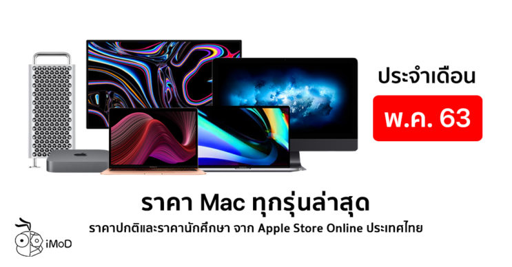 ข้ออมูลนี้จะแสดงราคาเริ่มต้นของ MacBook Pro, MacBook Air รุ่นใหม่ ปี 2020, iMac, iMac Pro, Mac mini รุ่นใหม่ ปี 2020 และ Mac Pro ล่าสุดที่วางจำหน่ายแต่ละรุ่นจาก Apple ทั้งราคาปกติและราคานักศึกษา ประจำเดือนพฤษภาคม 2563