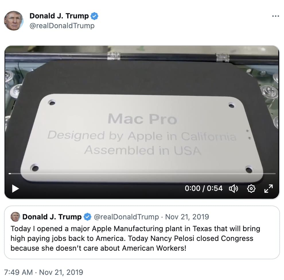 Apple เผยว่าการออกแบบชิ้นส่วน การพัฒนา และการประกอบ Mac Pro รุ่นปี 2019 เกิดขึ้นโดยบริษัทในสหรัฐฯ (ตามนโยบายของโจ ไบเดน) เพื่อขายลูกค้าในสหรัฐฯ บนฉลากระบุว่า “Designed by Apple in California. Assembled in USA.”
