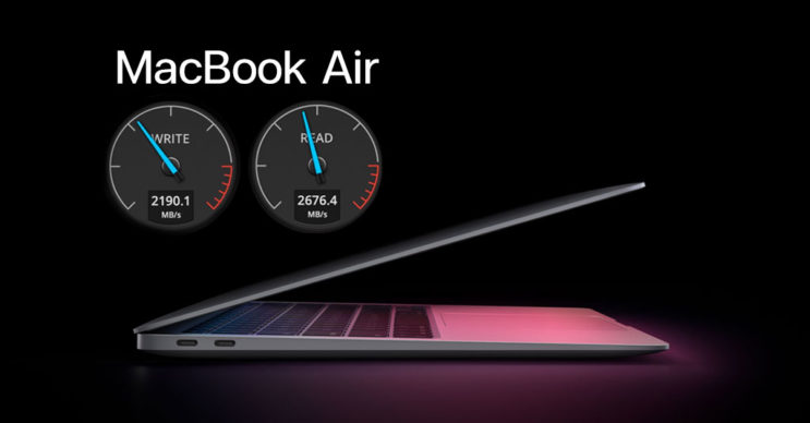 เมื่อเปรียบเทียบกับ MacBook Air รุ่นชิป Inel ปี 2019/2020 พบว่า MacBook Air รุ่นชิป M1 มีความเร็ว SSD สูงกว่า 2 เท่า โดยใน MacBook Air รุ่นชิป Inel ปี 2019 มีความเร็วในการเขียน 1048.2 MB/s, ความเร็วในการอ่าน 1385.1 MB/s