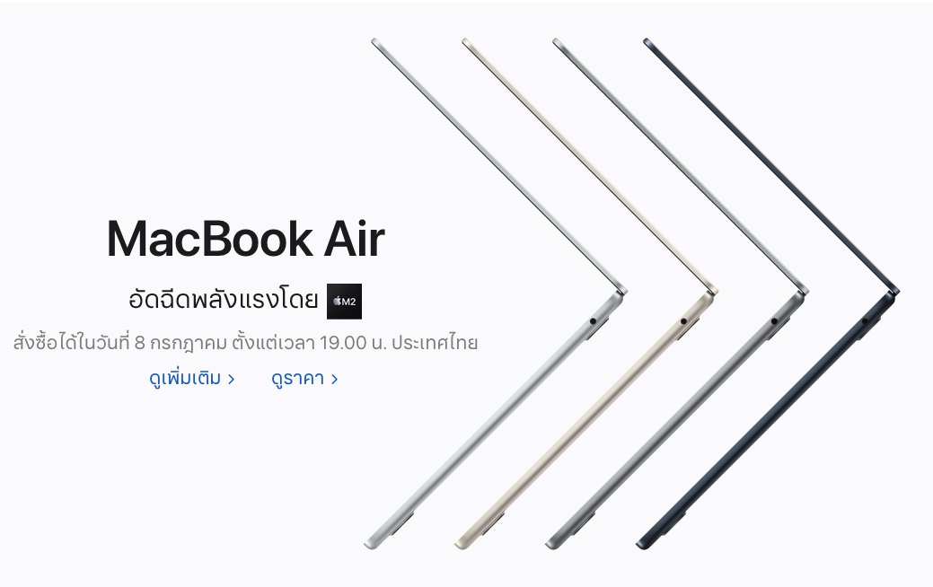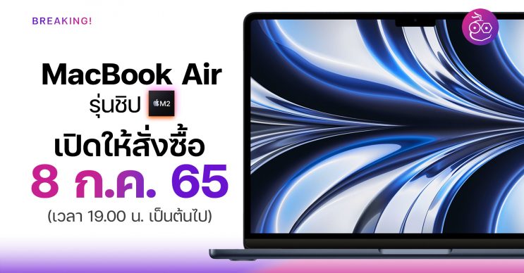 หลังเปิดตัวในงาน WWDC22 Apple ก็ประกาศวันเปิดให้สั่งซื้อ MacBook Air ชิป M2 แล้ว โดยจะเปิดให้สั่งซื้อวันที่ 8 ก.ค. 65 นี้ ผ่านเว็บ Apple, แอป Apple Store