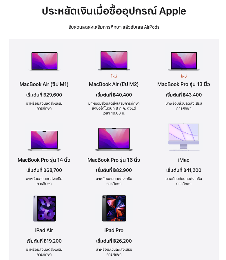 MacBook Air ชิป M2 ราคาเริ่มต้น 43,900 บาท และราคาส่งเสริมการศึกษาเริ่มต้นที่ 40,400 บาท เข้าโปรฯ Back to School ซื้อ Mac แถม AirPods 2 ด้วย