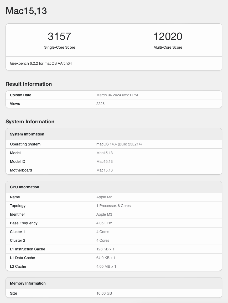 MySmartPrice พบข้อมูลคะแนน Benchmark ของ MacBook Air ชิป M3 ใน Geekbench 5 โดยเป็น MacBook Air ชิป M3 RAM 16GB มีคะแนน Single-core 3,157 คะแนน และ Multi-core 12,020 คะแนน