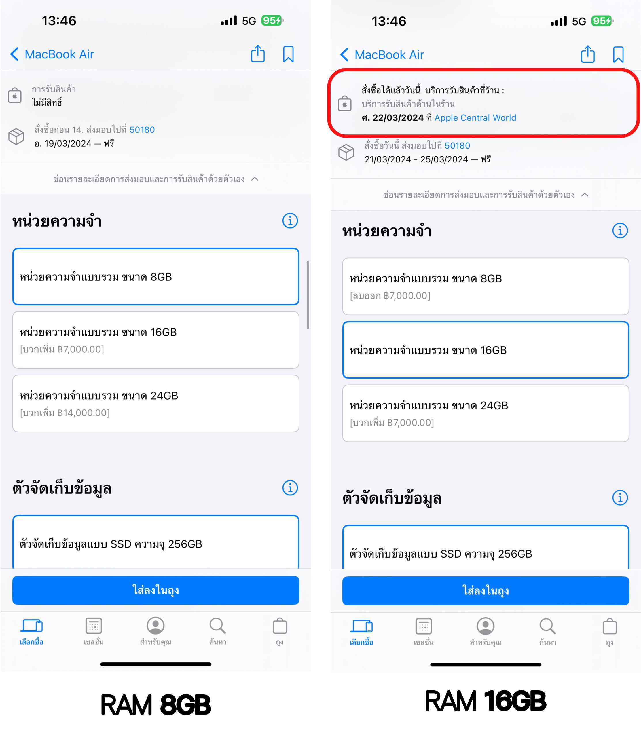 อีกหนึ่งข้อมูลน่าสนใจเรื่องสินค้าพร้อมจำหน่ายของ MacBook Air ชิป M3 โดยในรุ่น RAM 16GB สินค้าขายหน้าร้าน 22 มี.ค. นี้ แต่รุ่น 8GB ไม่มี