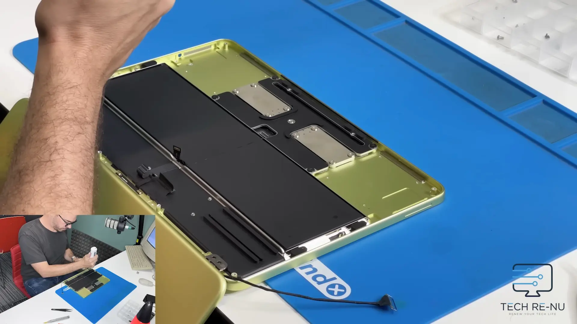 แบตเตอรี่ถูกยึดไว้ด้วยสกรู 18 ตัว และยกออกได้โดยตรง ไม่มีแถบกาวยืดหรือกาวเหนียวติดอยู่แต่อย่างใด โดยตลอดกระบวนการถอดชิ้นส่วนไม่พบเทปแม้แต่จุดเดียว ซึ่งถือเป็นครั้งแรกของเครื่อง Mac สมัยใหม่