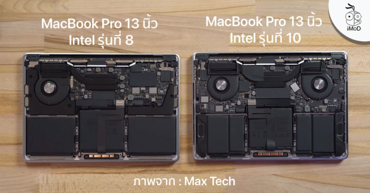 Max Tech แกะเครื่อง MacBook Pro 13 นิ้ว Intel รุ่นที่ 10 พบว่ามีพัดลมภายในถึง 2 ตัว เปรียบเทียบกับ MacBook Pro 13 นิ้ว lntel รุ่นที่ 10 มีพัดลมภายในเพียงตัวเดียว