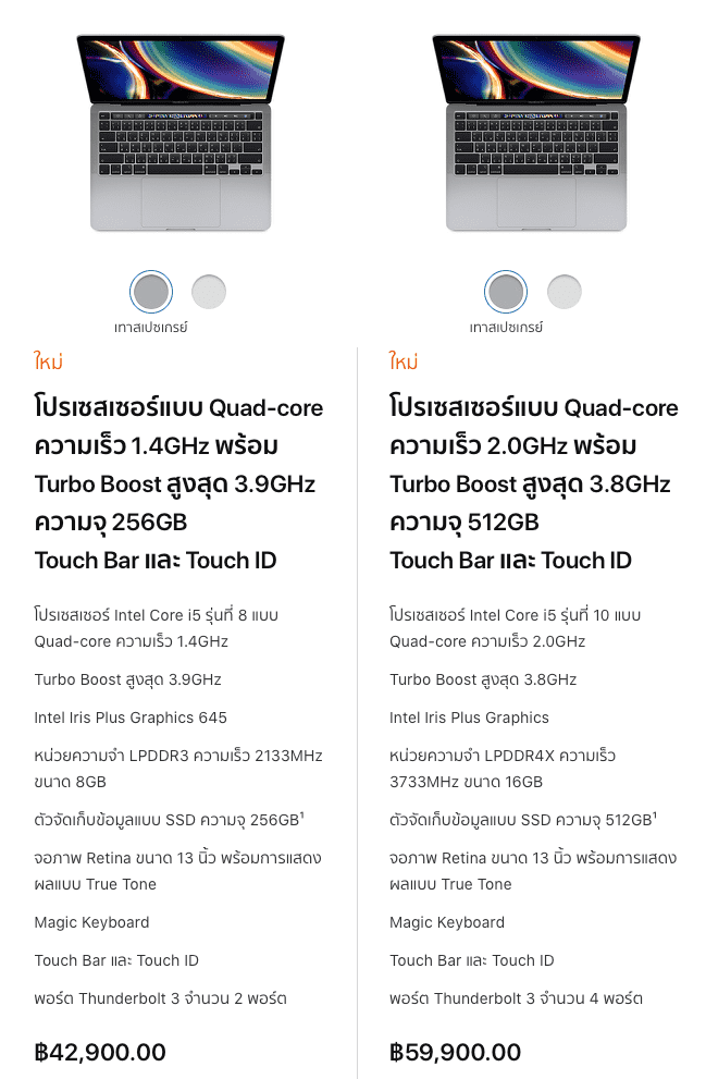MacBook Pro 13 นิ้ว Intel รุ่นที่ 10 เปิดขายในราคา 59,900 บาท ส่วนรุ่น Intel รุ่นที่ 8 เปิดขายในราคา 42,900 บาท แต่รุ่น Intel รุ่นที่ 10 มีจุดที่แตกต่างจากรุ่นเริ่มต้นหลายจุด โดยหากซื้อรุ่น Intel รุ่นที่ 10 จะมีในสิ่งที่รุ่น Intel รุ่นที่ 8 ไม่มี ดังนี้