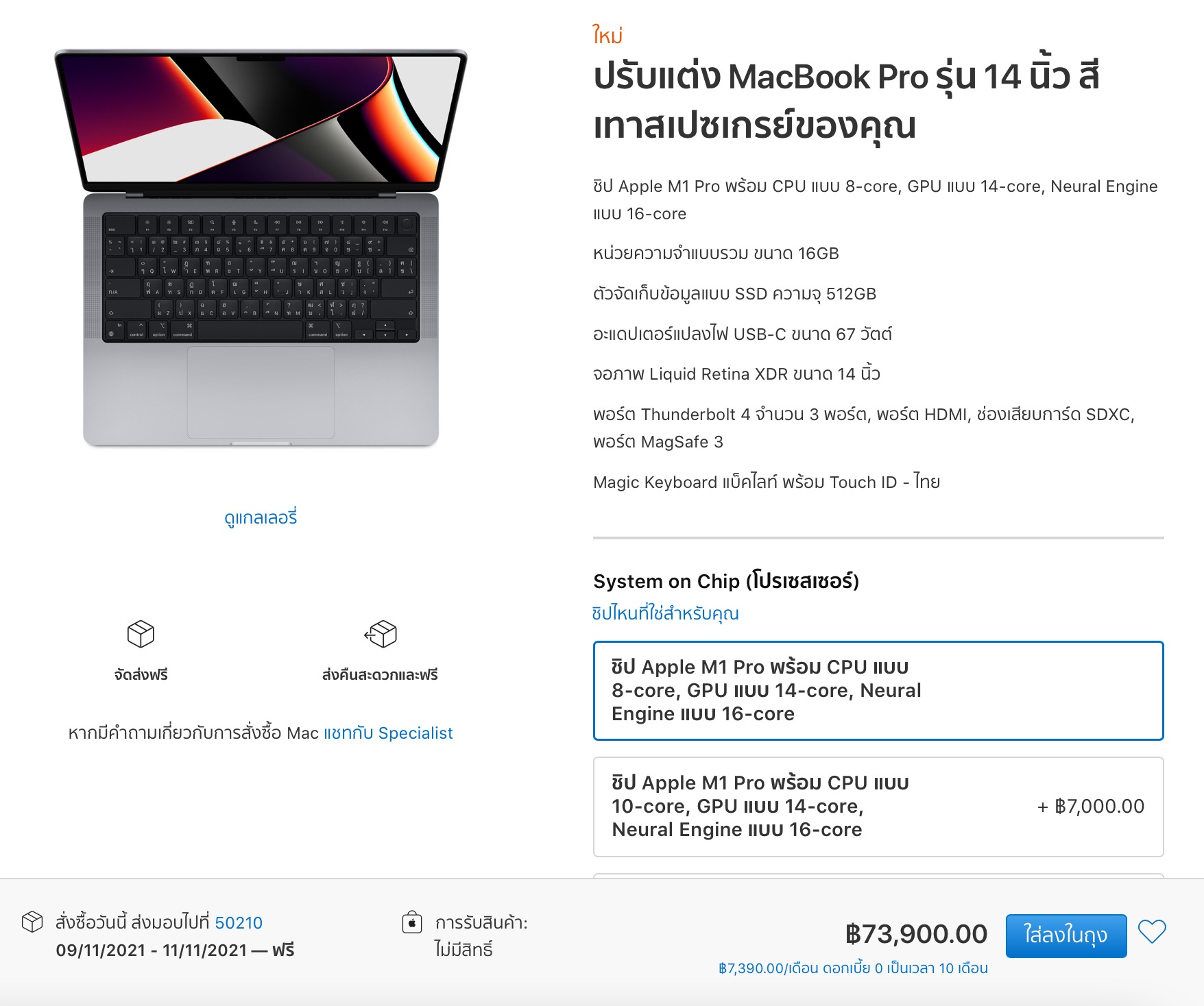 - MacBook Pro 14″ ชิป M1 Pro | CPU แบบ 8-core / GPU แบบ 14-core / RAM 16GB / SSD ความจุ 512GB ราคา 73,900 บาท