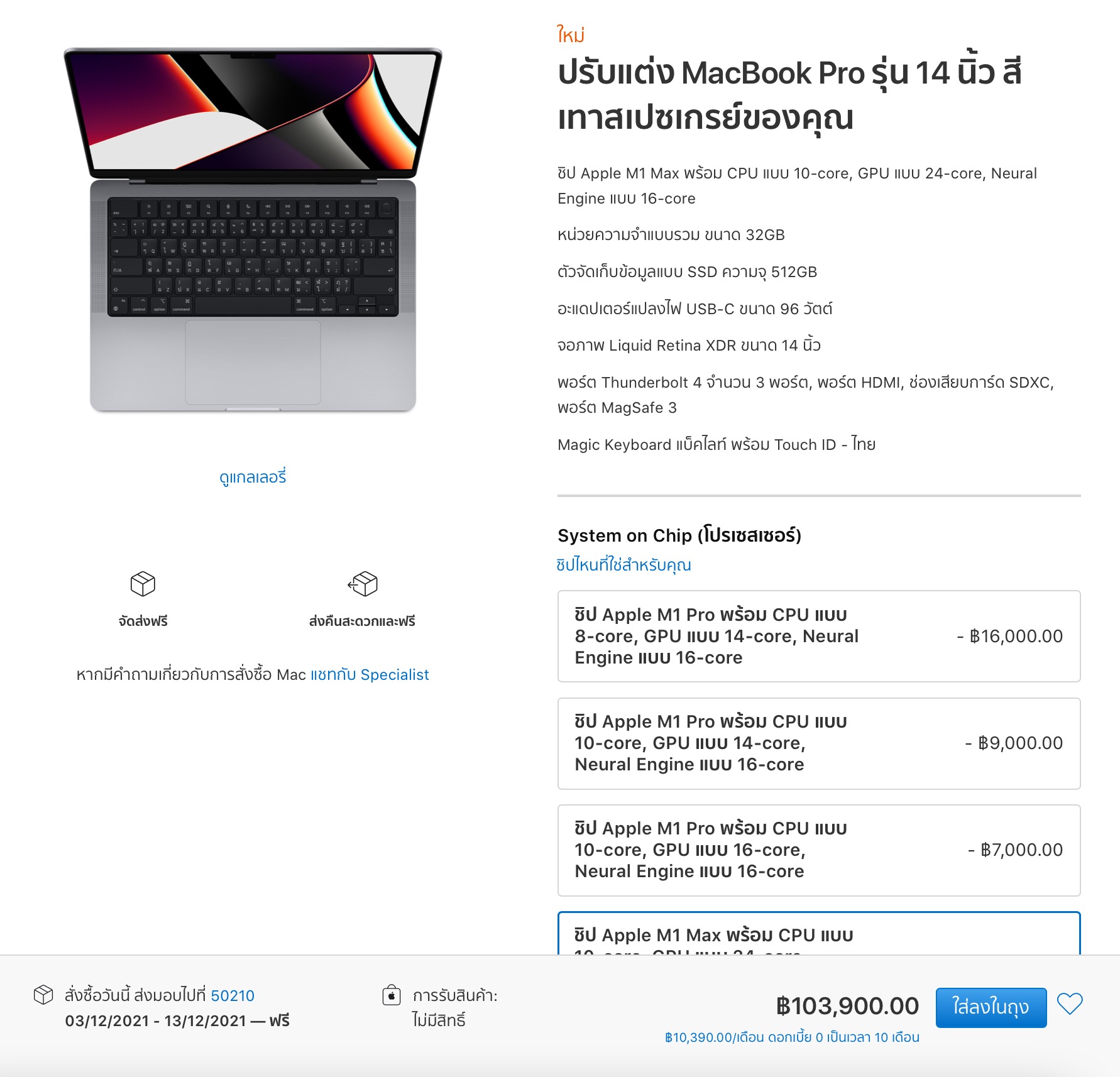 1 พ.ย. 64, Apple ได้เปิดให้สั่งซื้อ MacBook Pro 14″, 16″ ชิป M1 Pro | M1 Max แล้วที่ Apple Store Online ได้รับของไวสุดช่วงต้นเดือน พ.ย., ถ้าปรับแต่งรอนานหน่อย