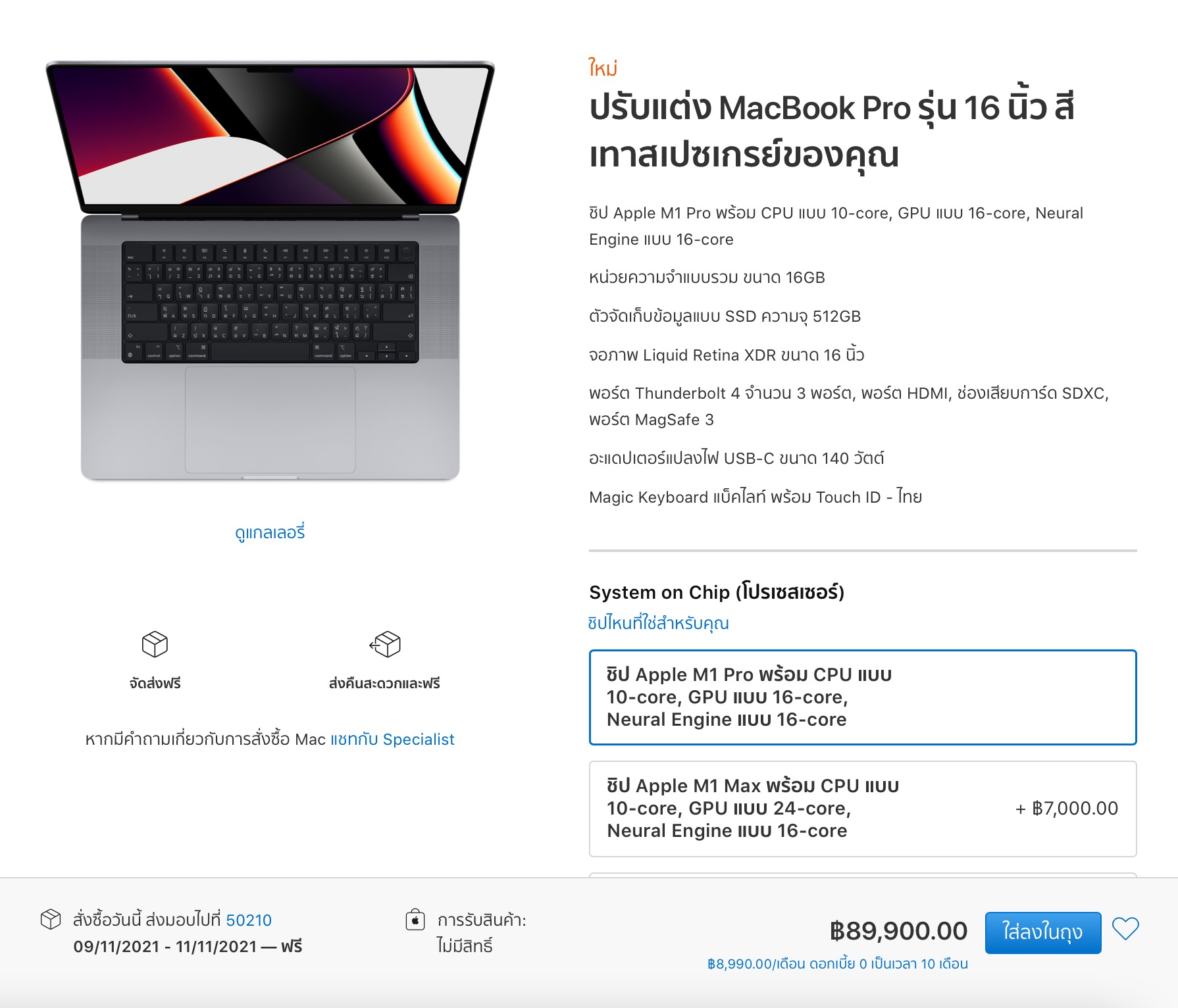 - MacBook Pro 16″ ชิป M1 Pro | CPU แบบ 10-core / GPU แบบ 16-core / RAM 16GB / SSD ความจุ 512GB ราคา 89,900 บาท