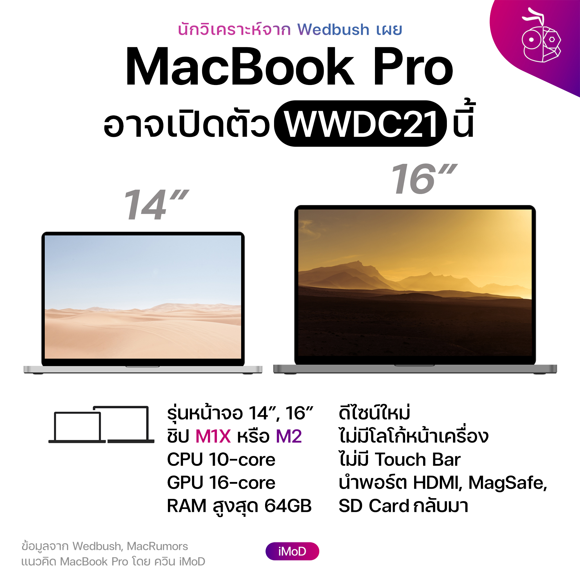 MacBook Pro รุ่นใหม่มีข่าวลือว่าจะปรับดีไซน์ตัวเครื่องให้เป็นทรงเหลี่ยมแบบเรียบ นำพอร์ตดั้งเดิมอย่าง SD Card, HDMI, MagSafe กลับมาด้วย และอาจใช้ชิป Apple Silicon ตัวใหม่อย่าง M1X หรือ M2 เลยก็ได้