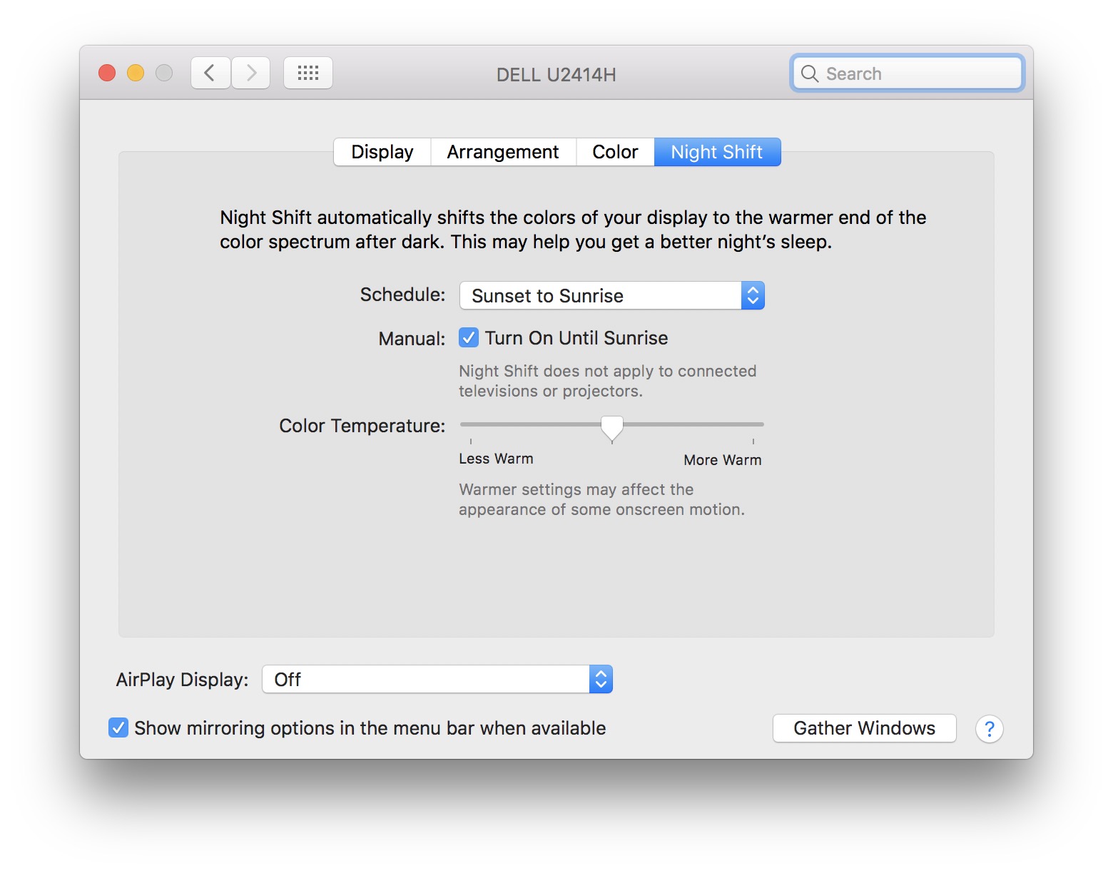 - เพิ่มโหมด Night Shift สำหรับปรับอุณภูมิของหน้าจอให้เหลืองนวลขึ้น เหมาะสมหรับใช้งานในเวลากลางคืน โหมดนี้สามารถใช้ได้บนเครื่อง Mac และจอที่ต่อพ่วง