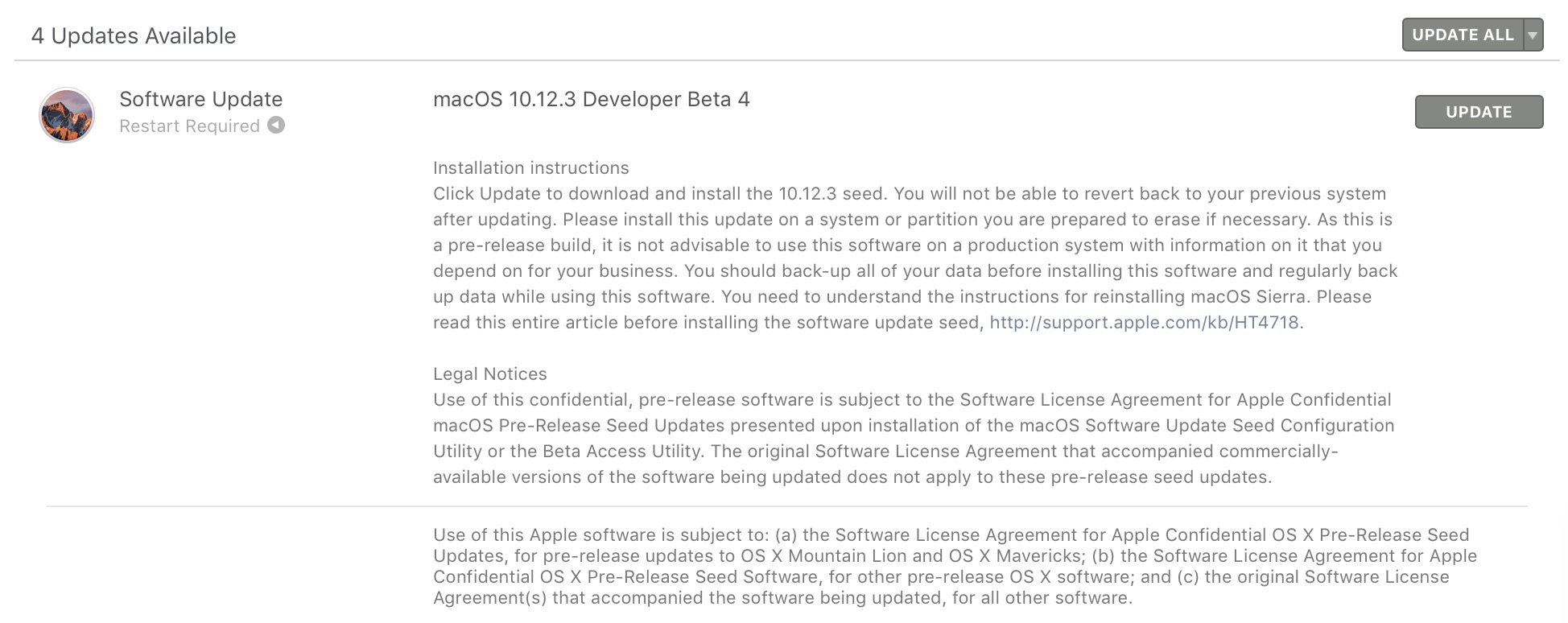 Apple อีกครั้งปล่อยอัปเดต macOS 10.12.3 Developer Beta 4 ให้นักพัฒนาได้ทดสอบกันหลังจากที่ก่อนหน้าเมื่อไม่นานมานี้ได้ปล่อย Developer Beta 3 ออกมาซึ่งจุดหลักคือการแก้ปัญหาที่สืบเนื่องจากบัคที่ทำให้ Macbook Pro 2016 นั้นแบตเตอรีหมดเร็ว