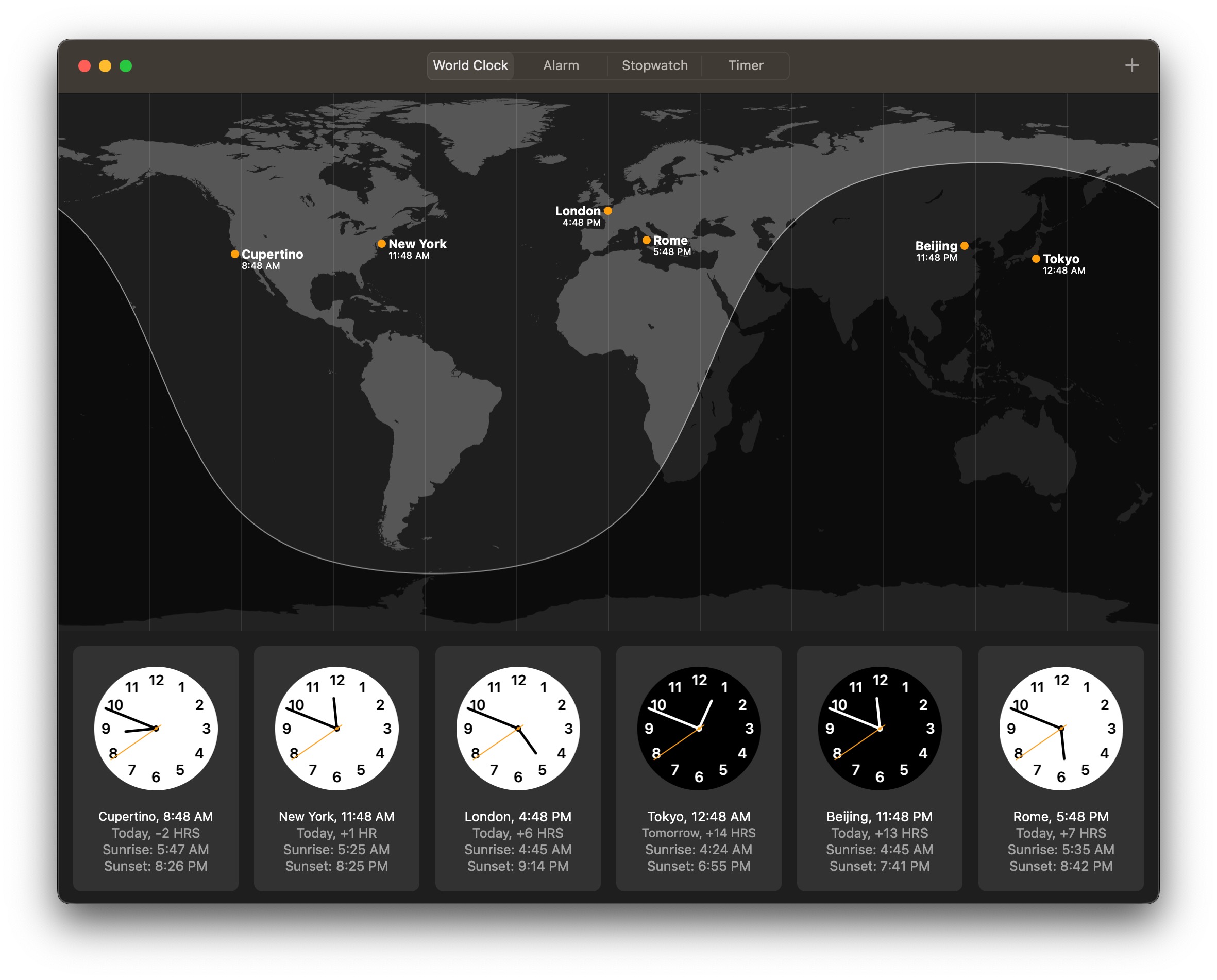 การออกแบบการแสดงผลของแอปนาฬิกาบน macOS 13 Ventura มีลักษณะคล้ายกับบน iPhone และ iPad โดยมี 4 แถบให้เลือกใช้งาน ได้แก่ นาฬิกาบอกเวลาโลก, นาฬิกาปลุก, นาฬิกาจับเวลา, และนาฬิกานับถอยหลัง โดนหน้าตาของนาฬิกาโลกจะแสดงผลได้เต็มหน้าต่าง ถ้าหากเราเพิ่มเวลาหลาย ๆ เมืองเข้ามาก็แสดงผลได้อย่างพอดี ส่วนหน้าตาของนาฬิกาอื่น ๆ ก็จะใช้พื้นที่ไม่ค่อยเยอะ